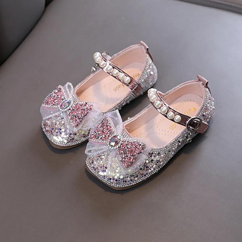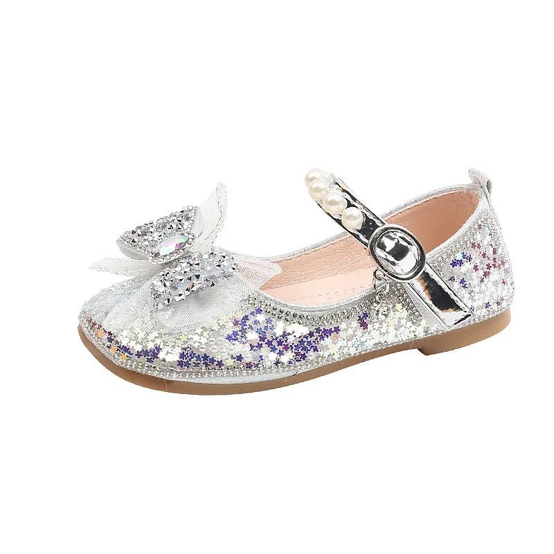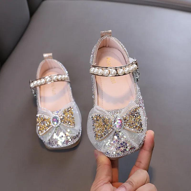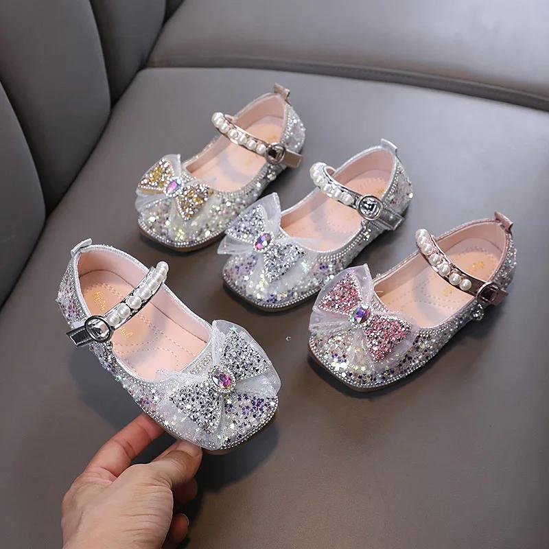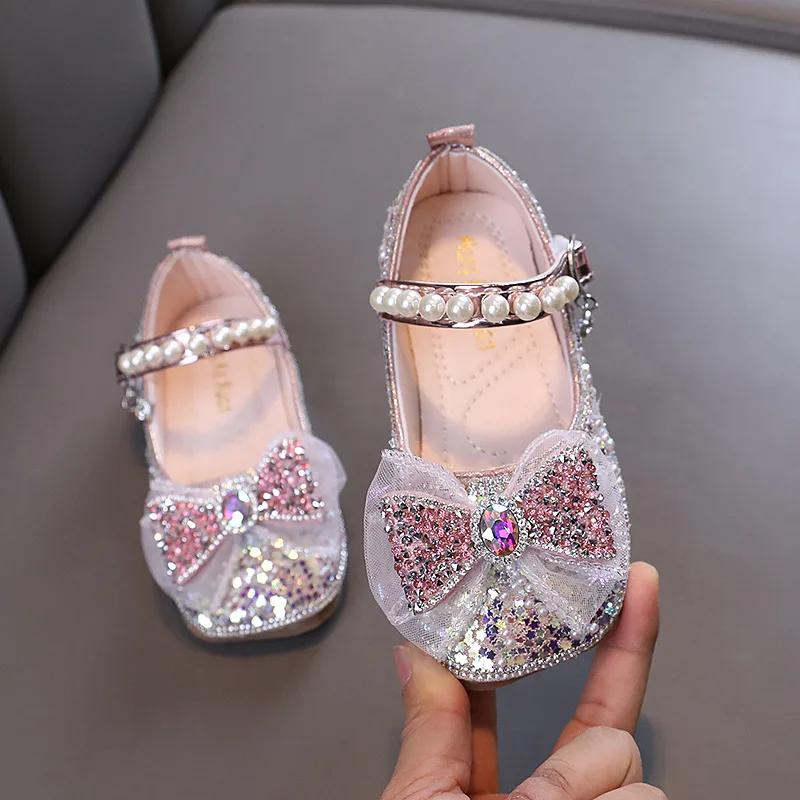 2024 Новые детские кожаные туфли с милым жемчужным бантом, роскошные туфли для девочек на свадьбу, модные повседневные блестящие детские туфли принцессы
