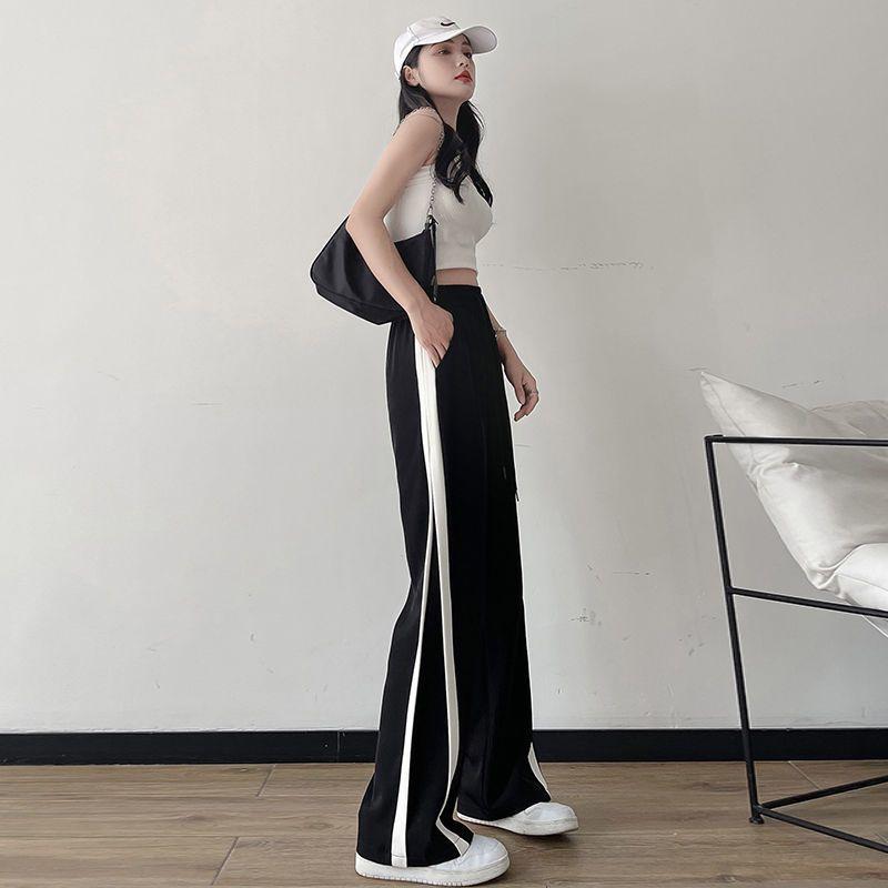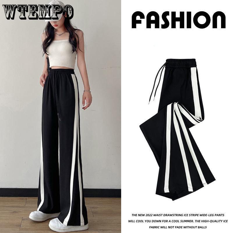 Женские брюки, черные шелковые брюки с высокой талией, широкие брюки, прямые повседневные брюки, полосатые спортивные штаны большого размера