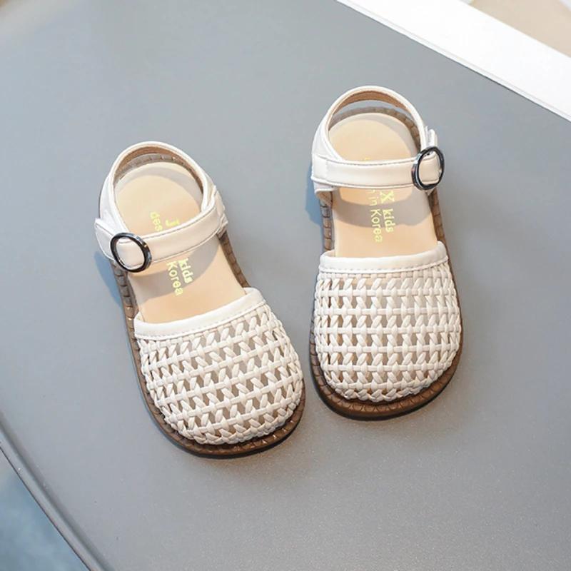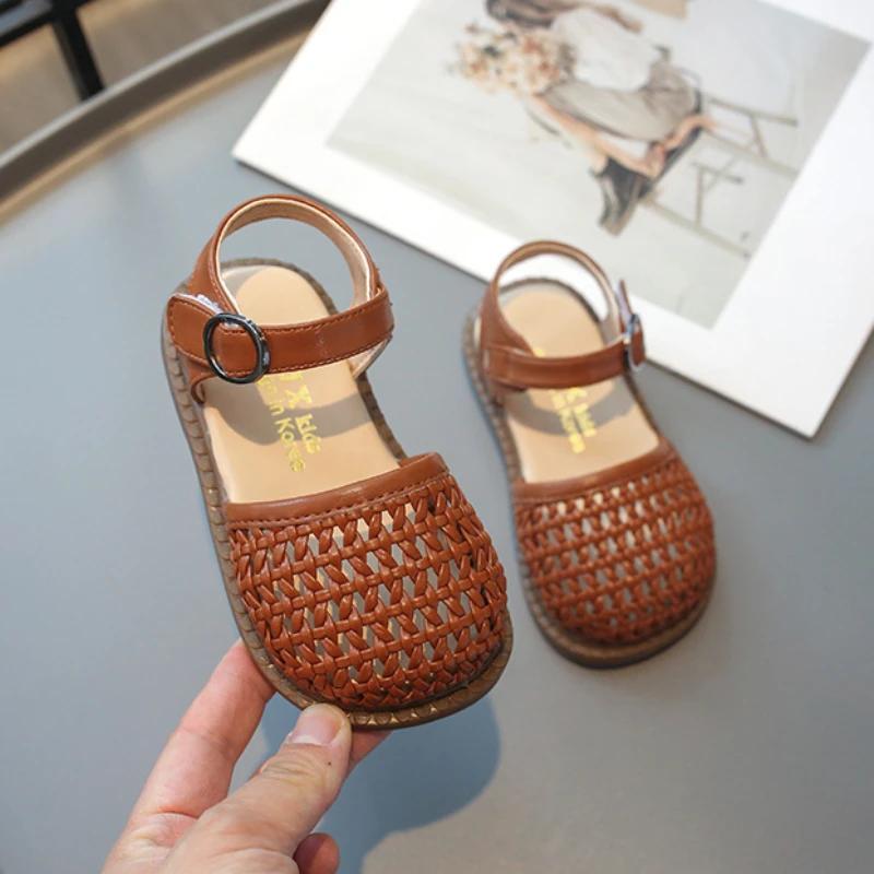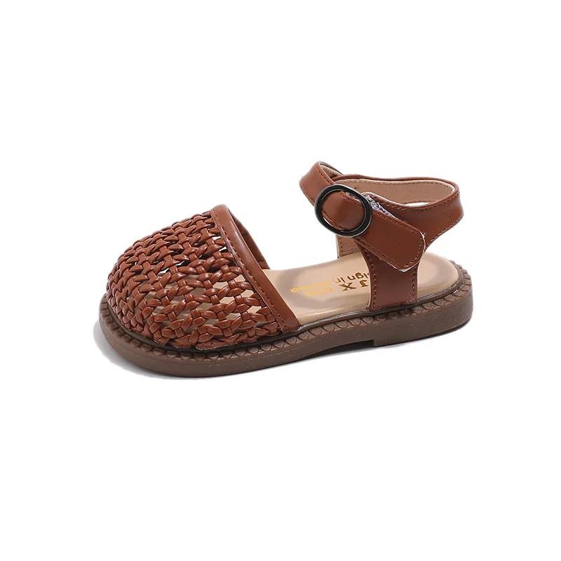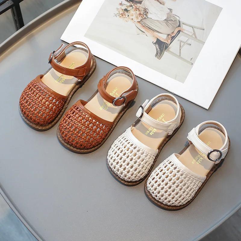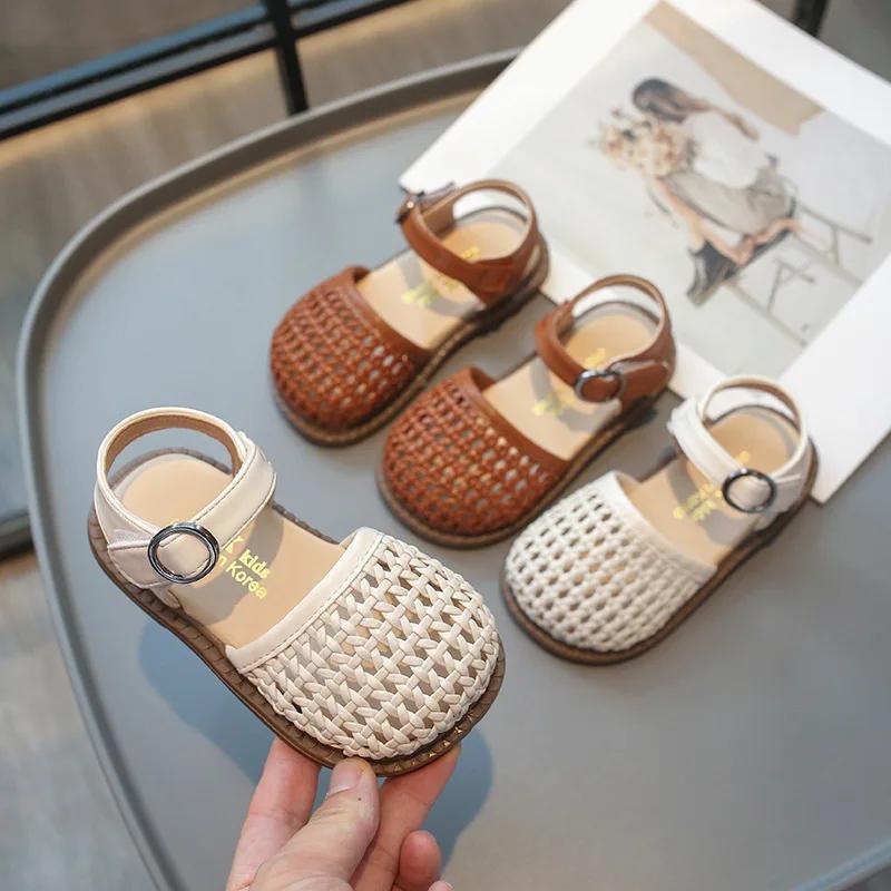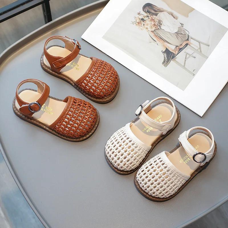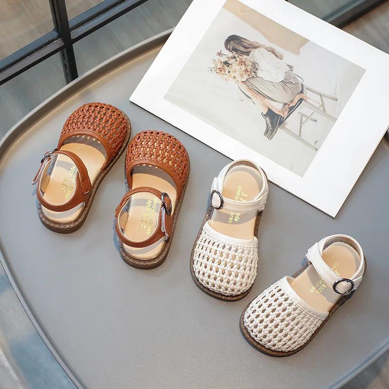 Детские сандалии для девочек, закрытые пальчики, летние, для малышей, повседневные, для ходьбы, на плоской подошве, модные, однотонные, детские, с вырезами, пляжные сандалии