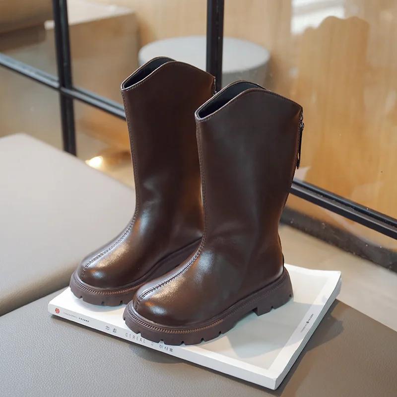 Детские кожаные сапоги, модные повседневные высокие сапоги для девочек, обувь принцессы из искусственной кожи, 2024, осенние новые детские высокие сапоги с молнией сзади
