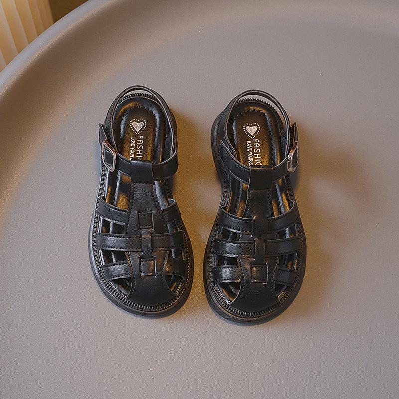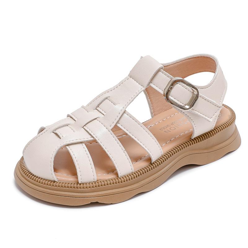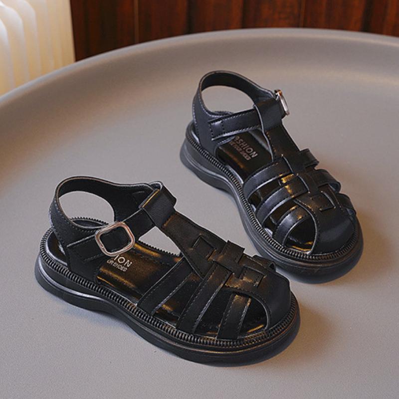 Летние плетеные однотонные сандалии для девочек, сандалии с закрытым носком, детские резиновые нескользящие туфли на плоской подошве, модная детская пляжная обувь с вырезами на липучке
