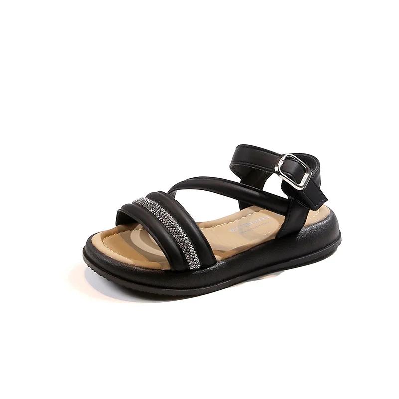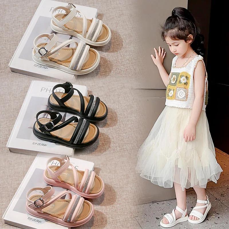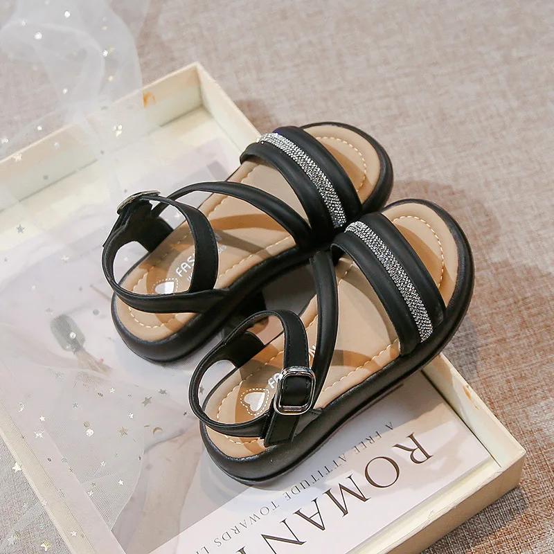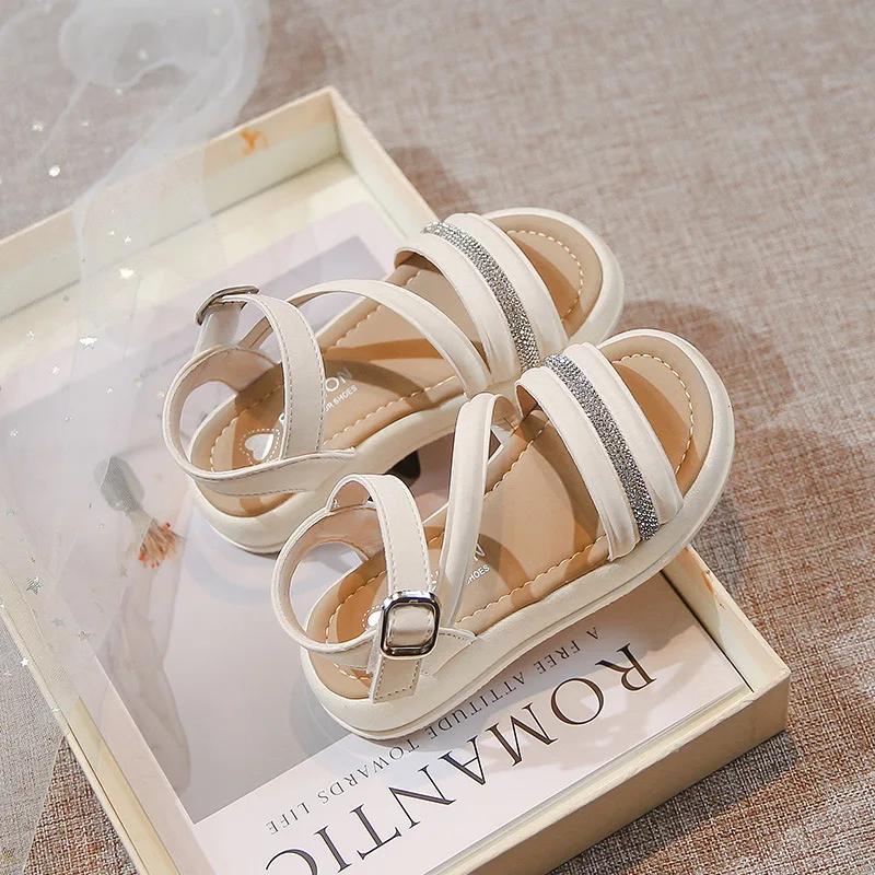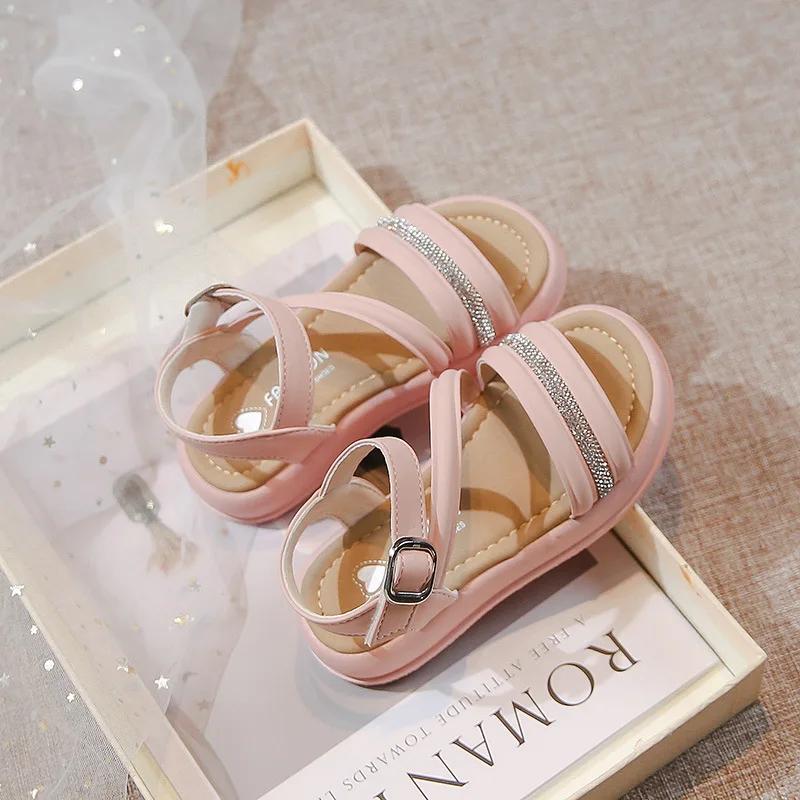 Сандалии для девочек с кристаллами 2024 года, новые нескользящие мягкие подошвы, детская универсальная модная обувь для принцесс, детская модная милая пляжная обувь