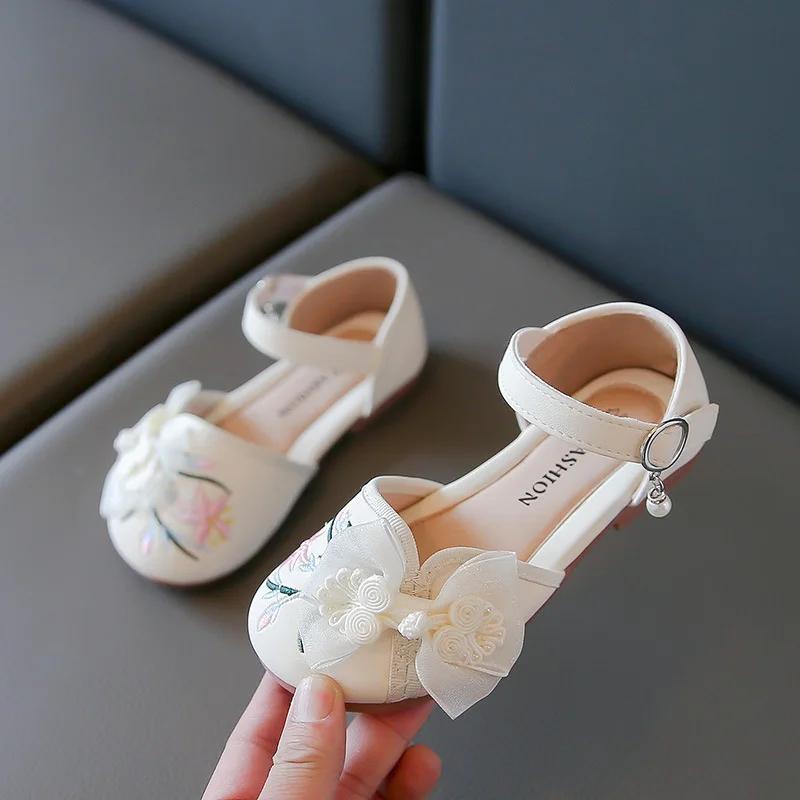 Детские милые сандалии 2024 года, летние новые туфли для девочек в стиле ретро, универсальные туфли принцессы, детские милые вышитые кожаные туфли для вечеринки, свадьбы
