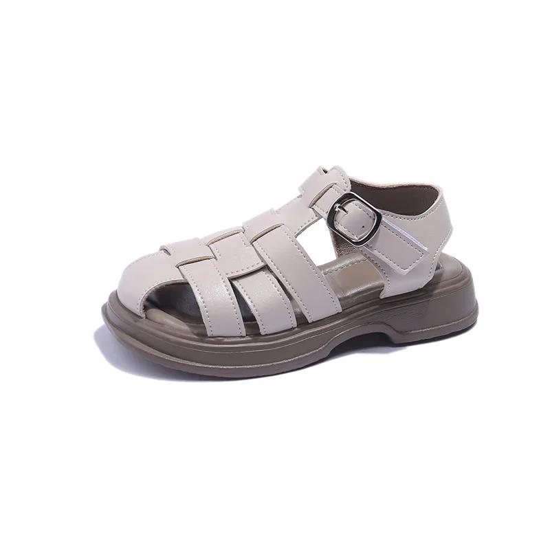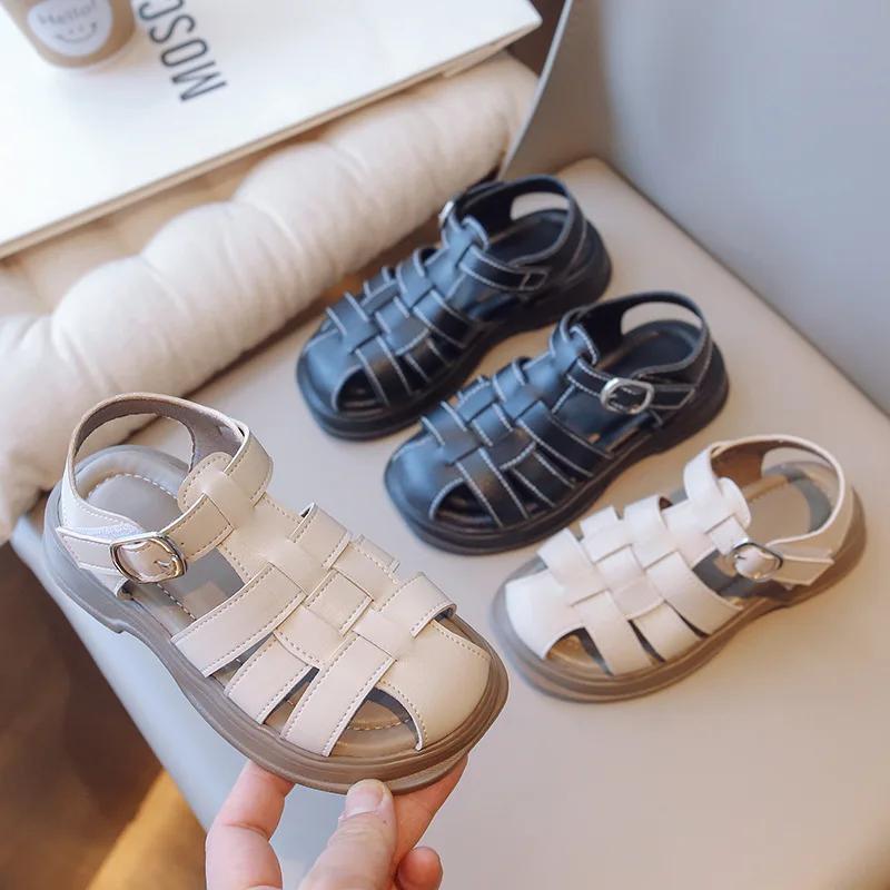 Обувь для девочек в стиле ретро, летние детские сандалии с открытыми головками 2024 года, однотонная мягкая модная пляжная обувь для отпуска