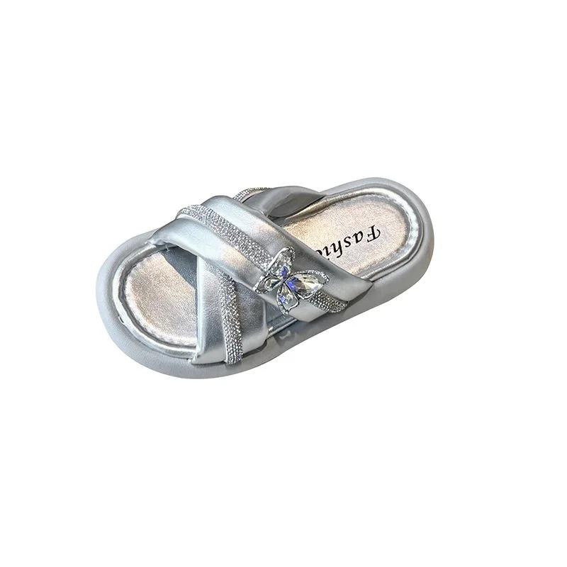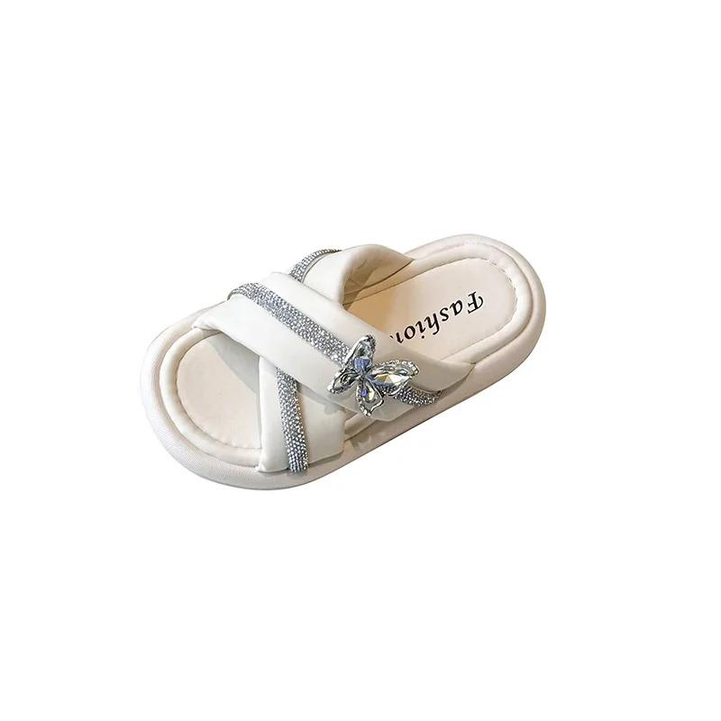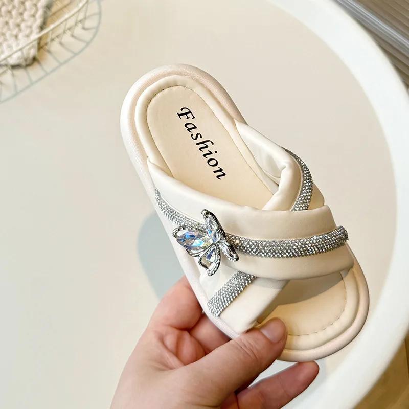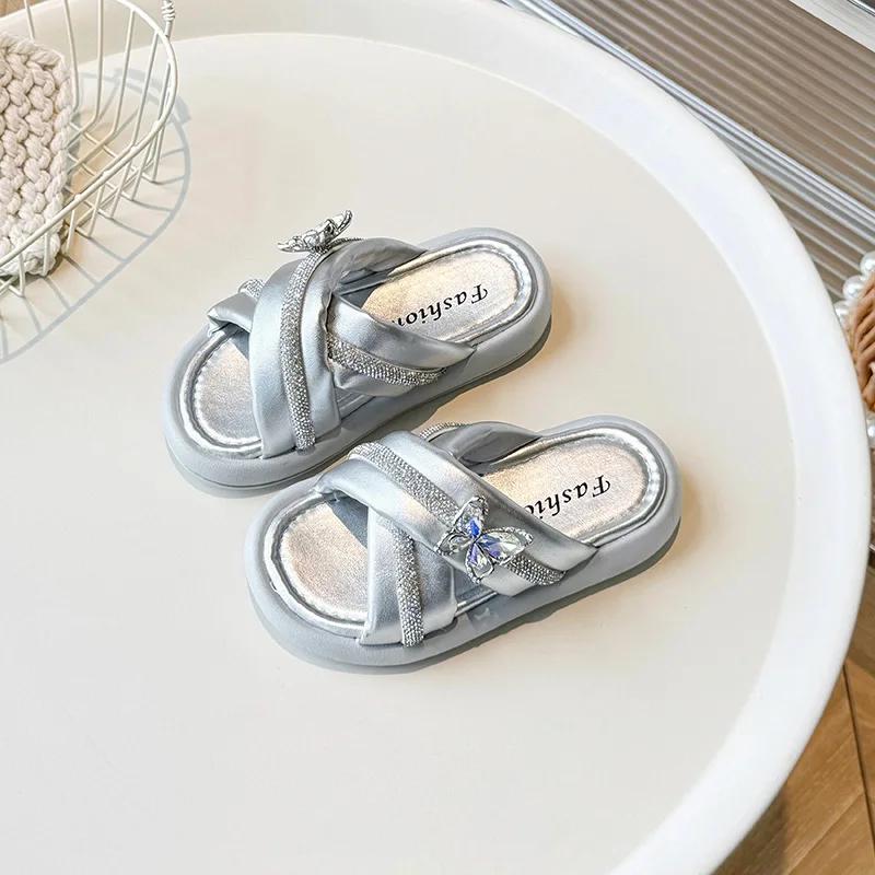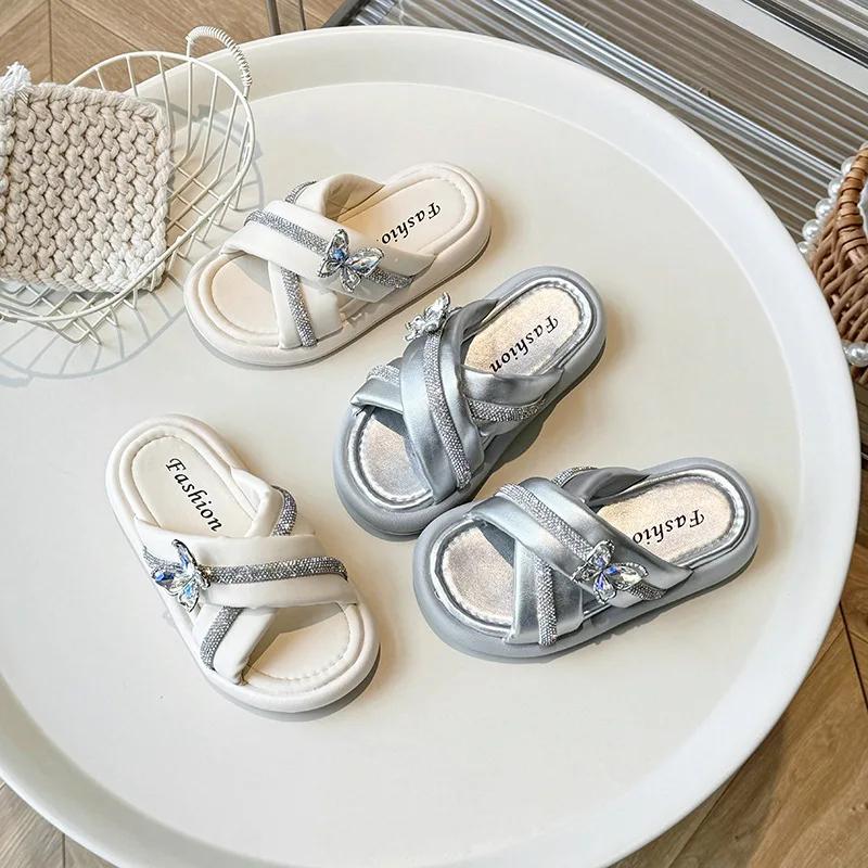 Новые сандалии принцессы для девочек с блестящими кристаллами 2024 года, новые детские тапочки с милыми бабочками, повседневная пляжная обувь для девочек на открытом воздухе