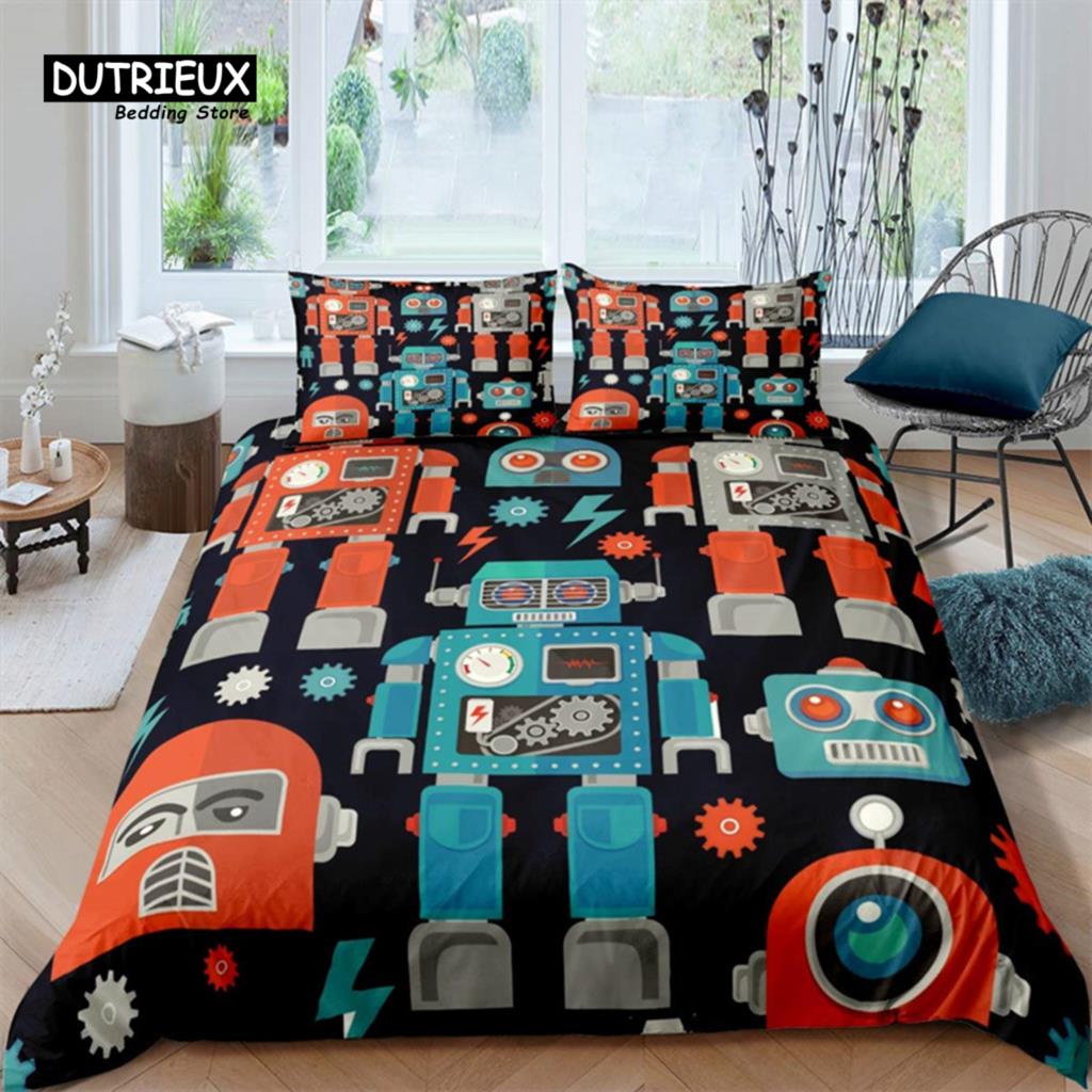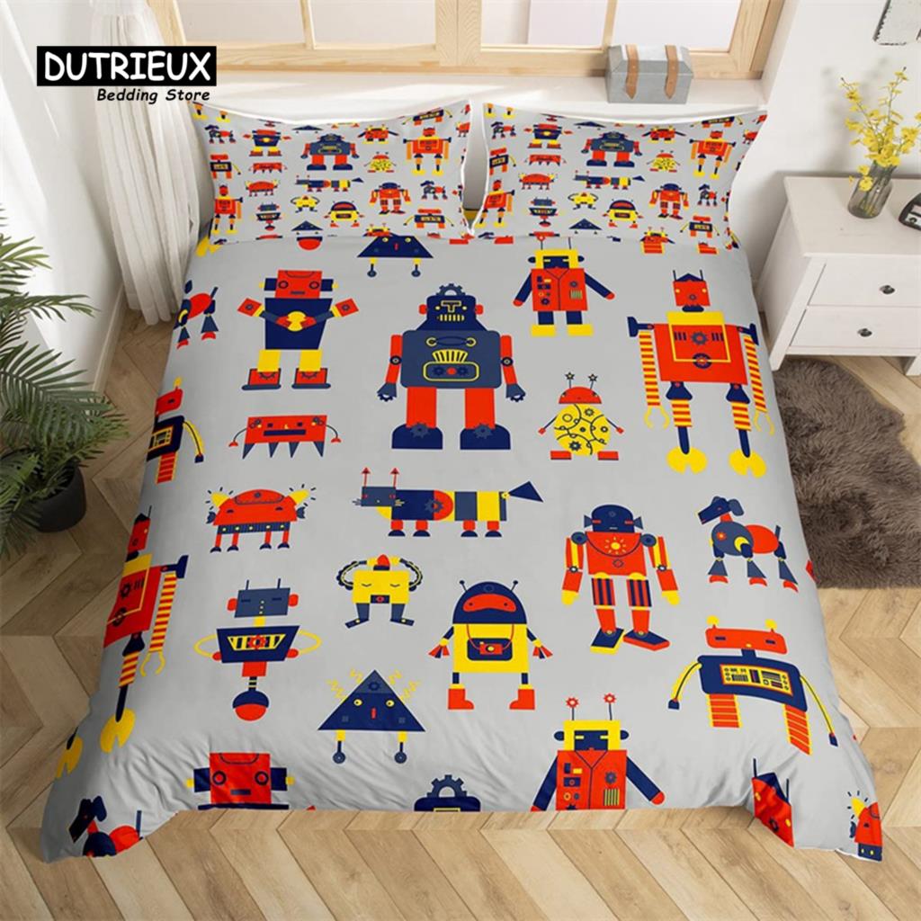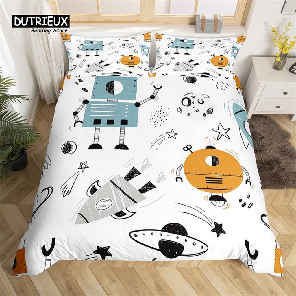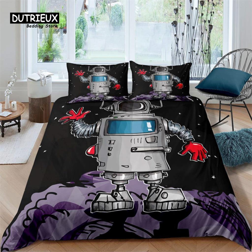Комплект постельного белья с изображением робота, мультяшный космический робот, комплект постельного белья в стиле пэчворк, футуристическая машина, одеяло, чехол для близнеца, полный комплект для мальчика