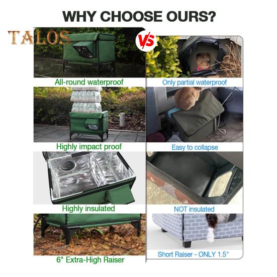 Атмосферостойкий дизайн: Приподнятая конструкция этого домика для кошек предотвращает скопление влаги на дне, поддерживая сухую и комфортную среду для ваших пушистых друзей.. Этот отапливаемый домик для кошек, оснащенный водонепроницаемыми розетками для грелок для кошек, карнизами, крышами и эвакуационными дверцами, способен выдерживать суровые погодные условия, обеспечивая при этом вашим питомцам уют.
