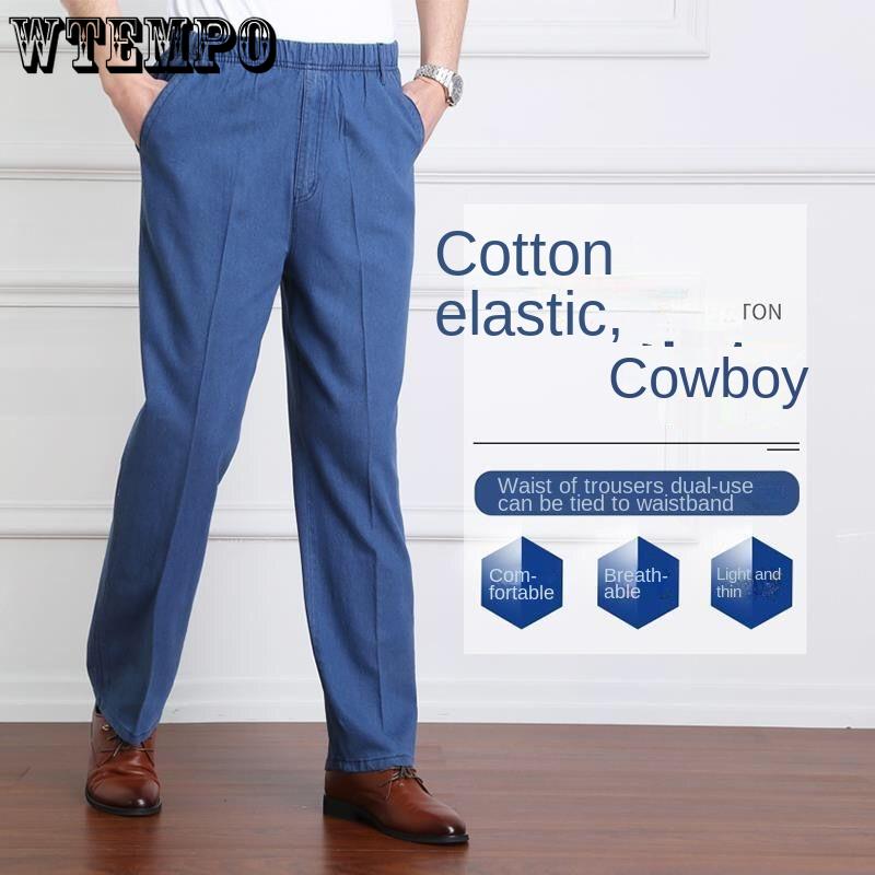 Мужские джинсы среднего и старшего возраста, свободные повседневные прямые брюки, новые летние повседневные брюки, весенние брюки с высокой талией и эластичной резинкой на талии для папы
