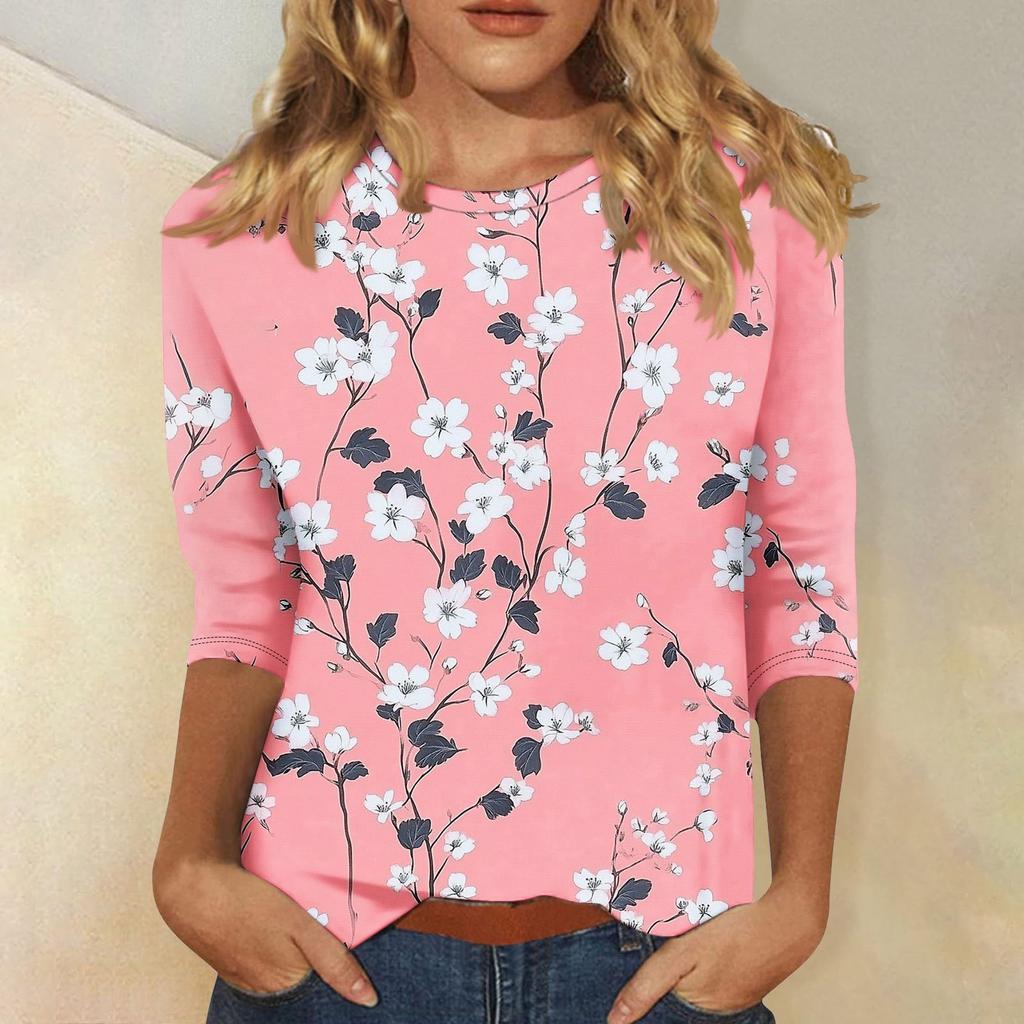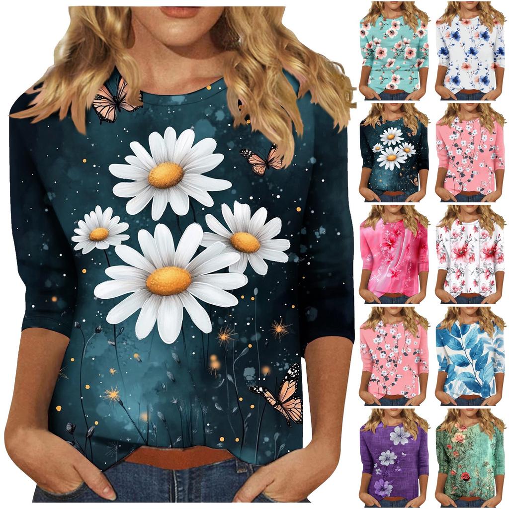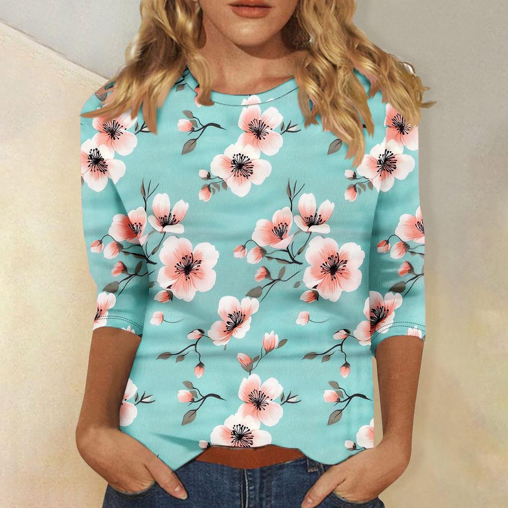 Женская мода повседневная три четверти рукава цветочный принт горловина топ