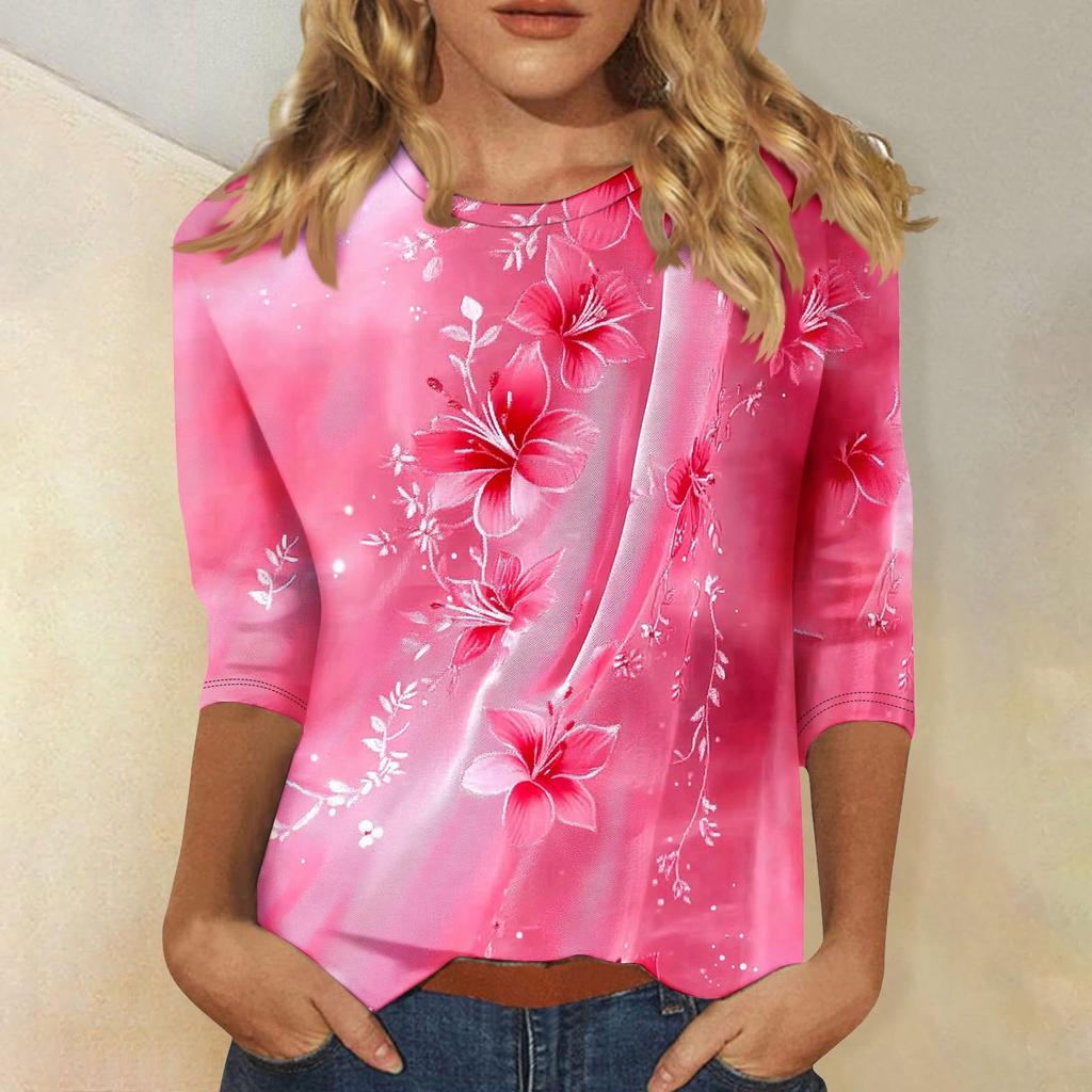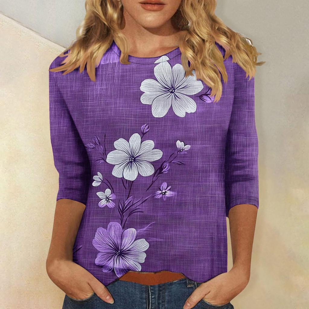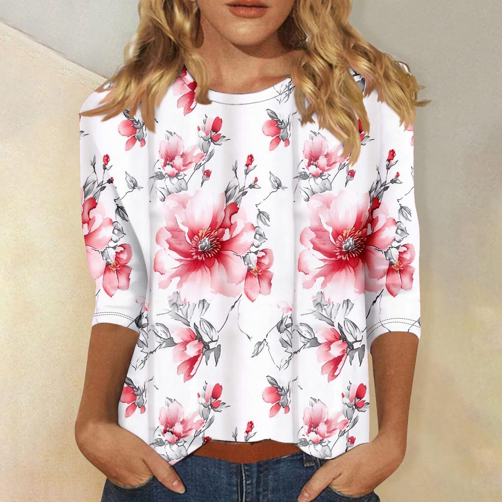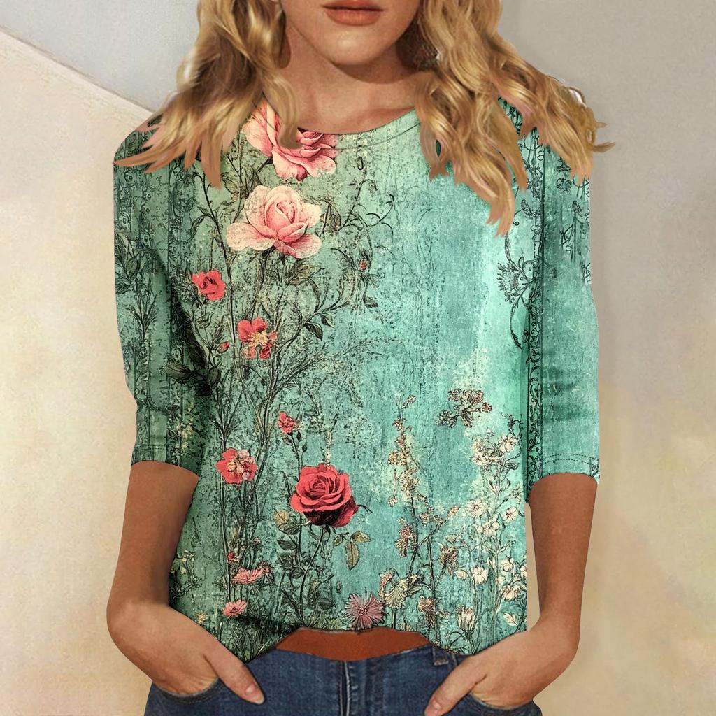 Женская мода повседневная три четверти рукава цветочный принт горловина топ