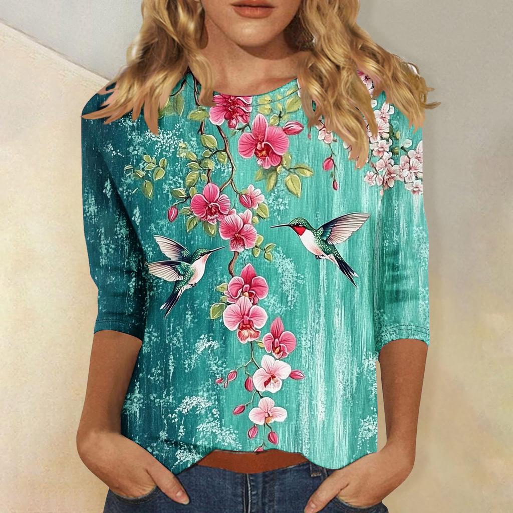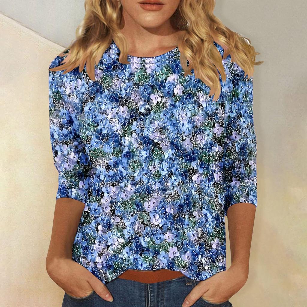 Женская мода повседневная три четверти рукава цветочный принт горловина топ