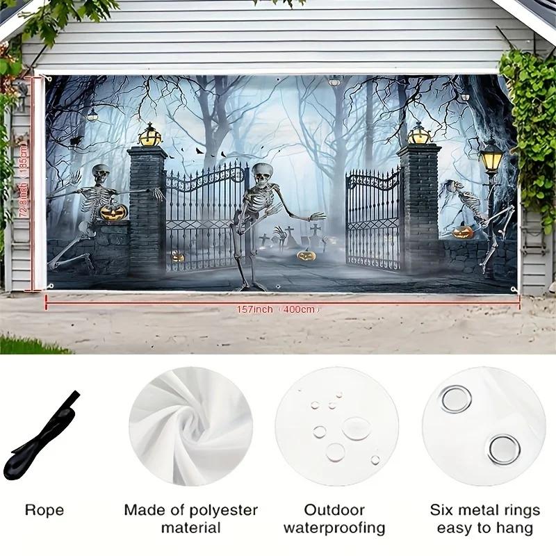 Жуткий баннер на гаражные ворота на Хэллоуин - большое наружное украшение, идеально подходит для вечеринок и праздничных торжеств, не требует питания