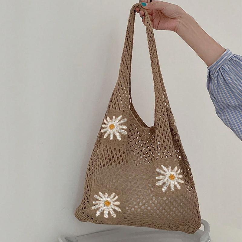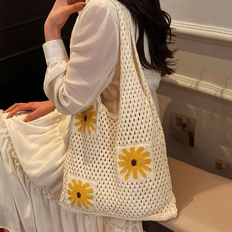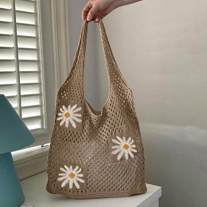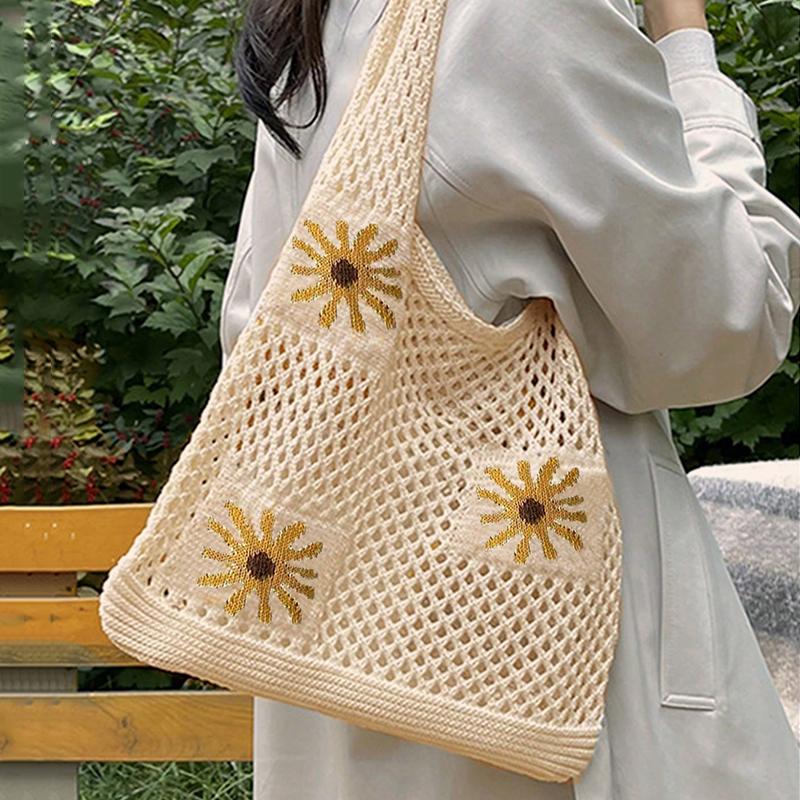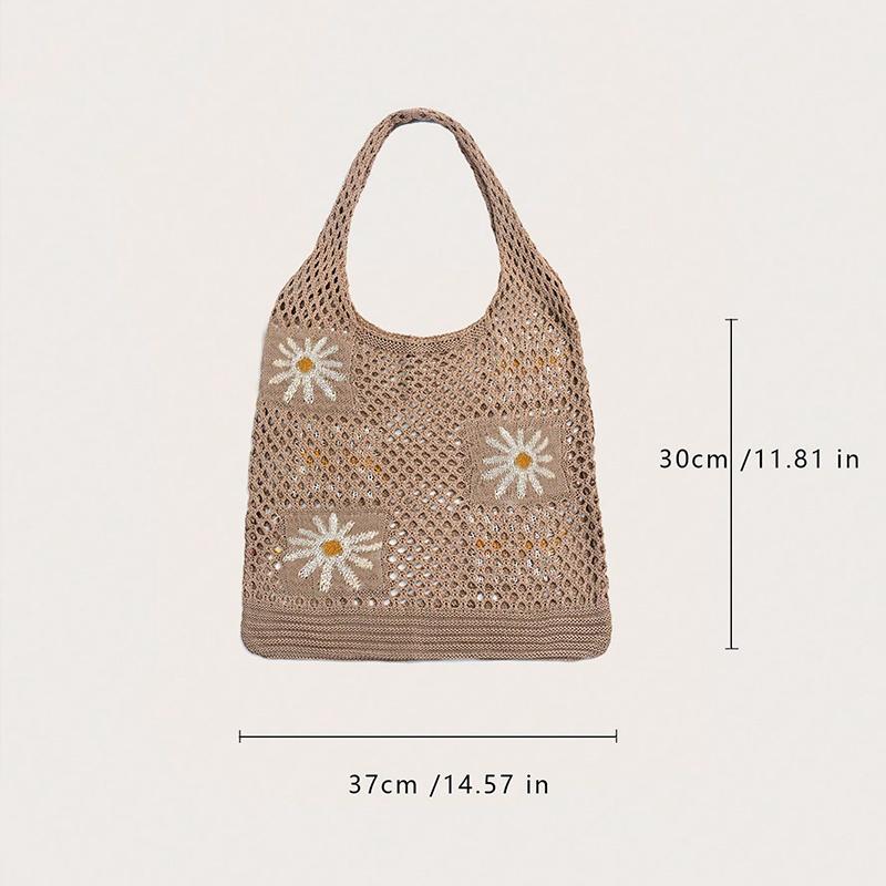 Yogodlns Женская летняя пляжная сумка с милым цветочным узором, вязаная крючком, повседневная сумка, модная сумка для повседневного офисного использования, вязаная сумка