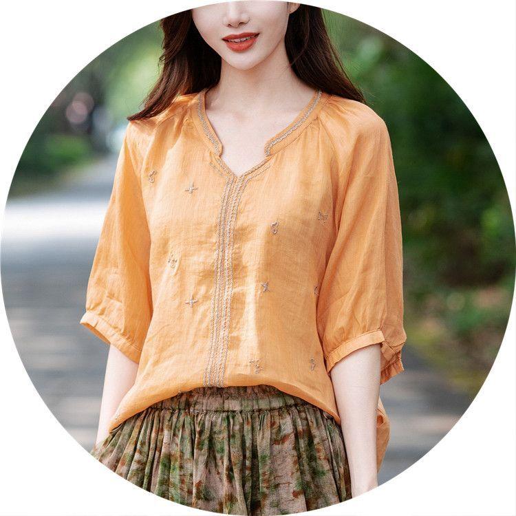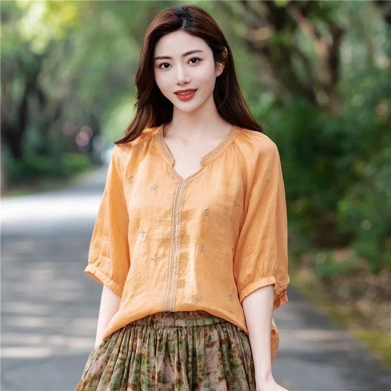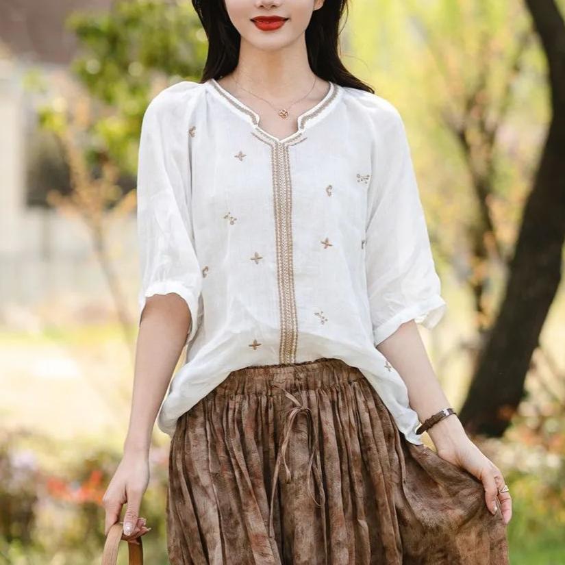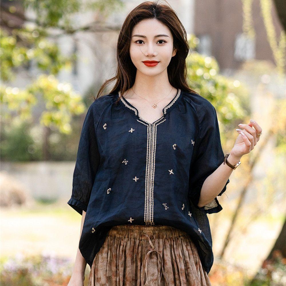 Хлопок льняная вышитая рубашка женская летняя рубашка-пуловер ретро футболка свободный топ с V-образным вырезом рубашки