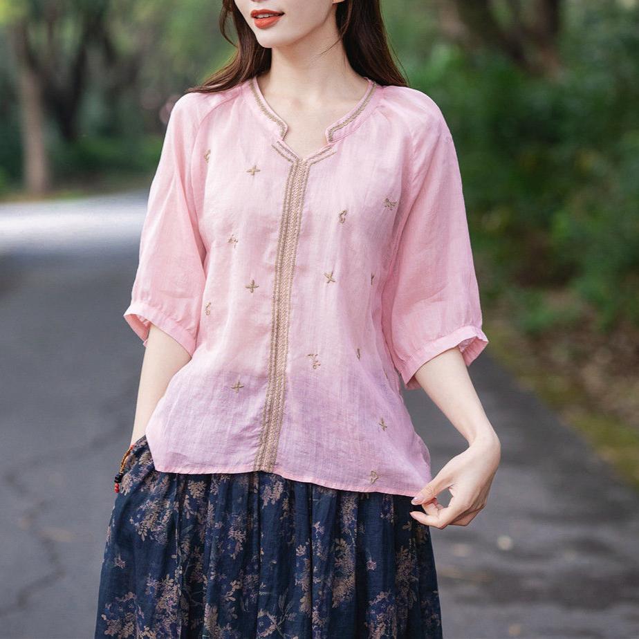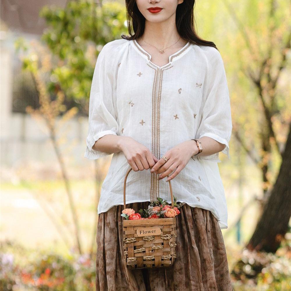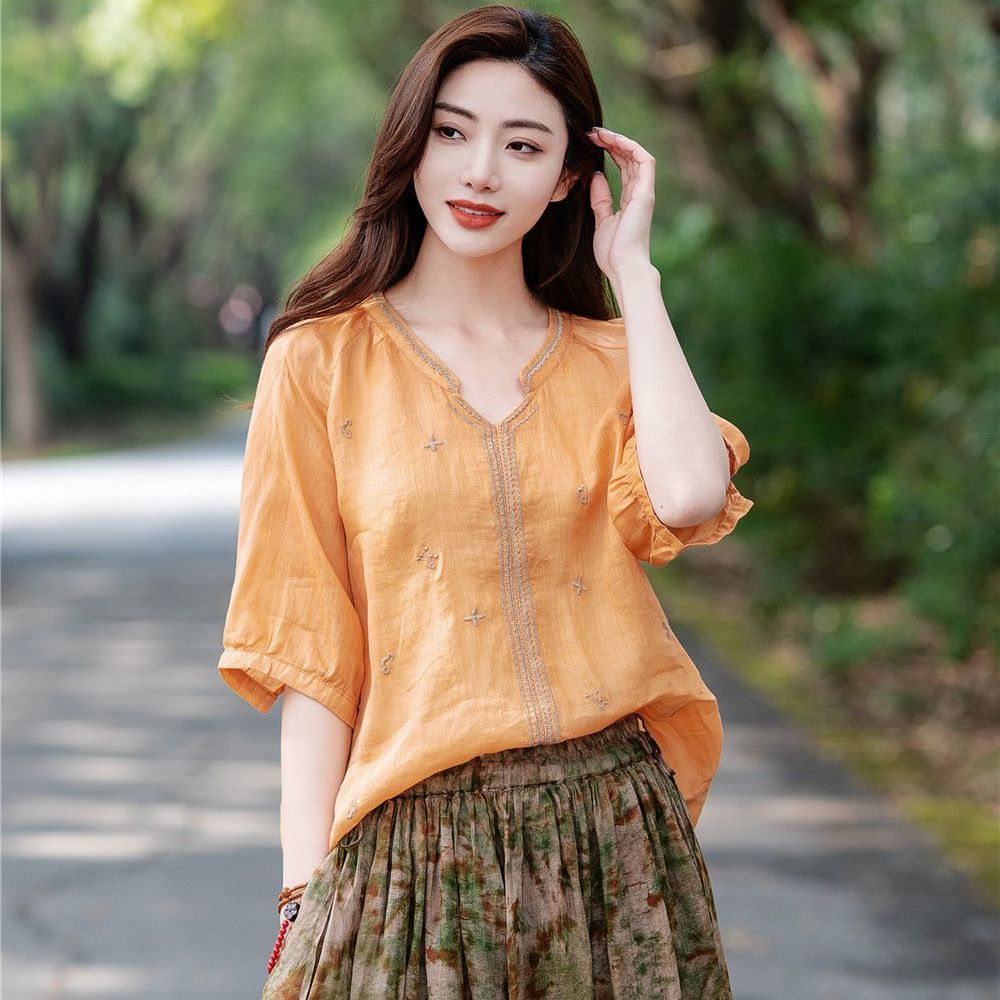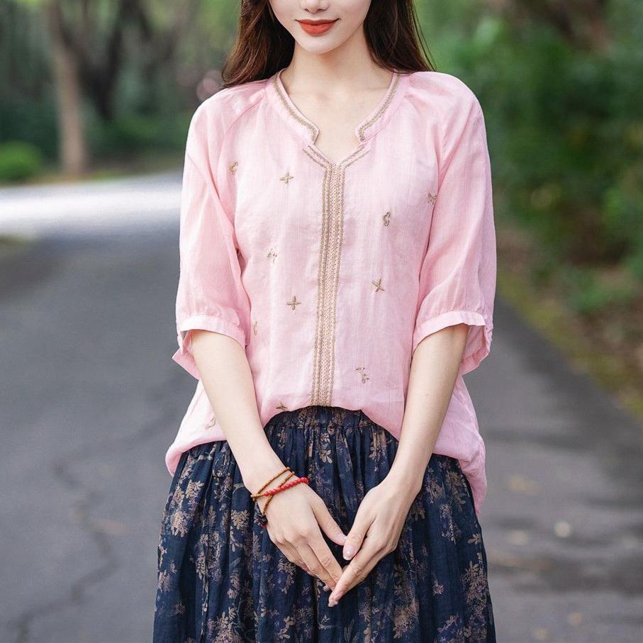Хлопок льняная вышитая рубашка женская летняя рубашка-пуловер ретро футболка свободный топ с V-образным вырезом рубашки