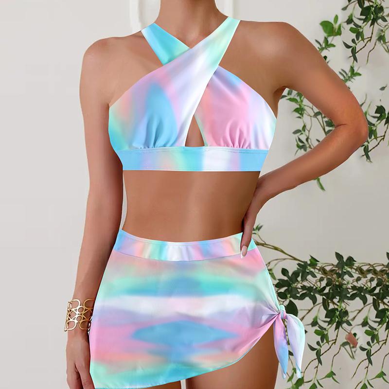Плюс размер Женская мода сексуальный круглый вырез красочный небо бикини комплект облегающий пляжный купальники комплект из двух частей