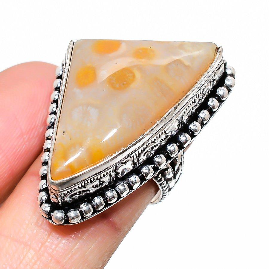 Кольцо из серебра 925 пробы с ископаемым кораллом ручной работы, размер 7 B0l42