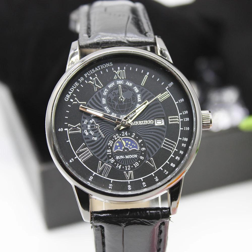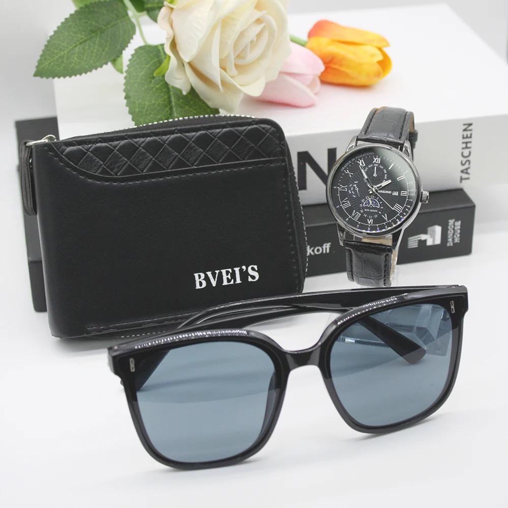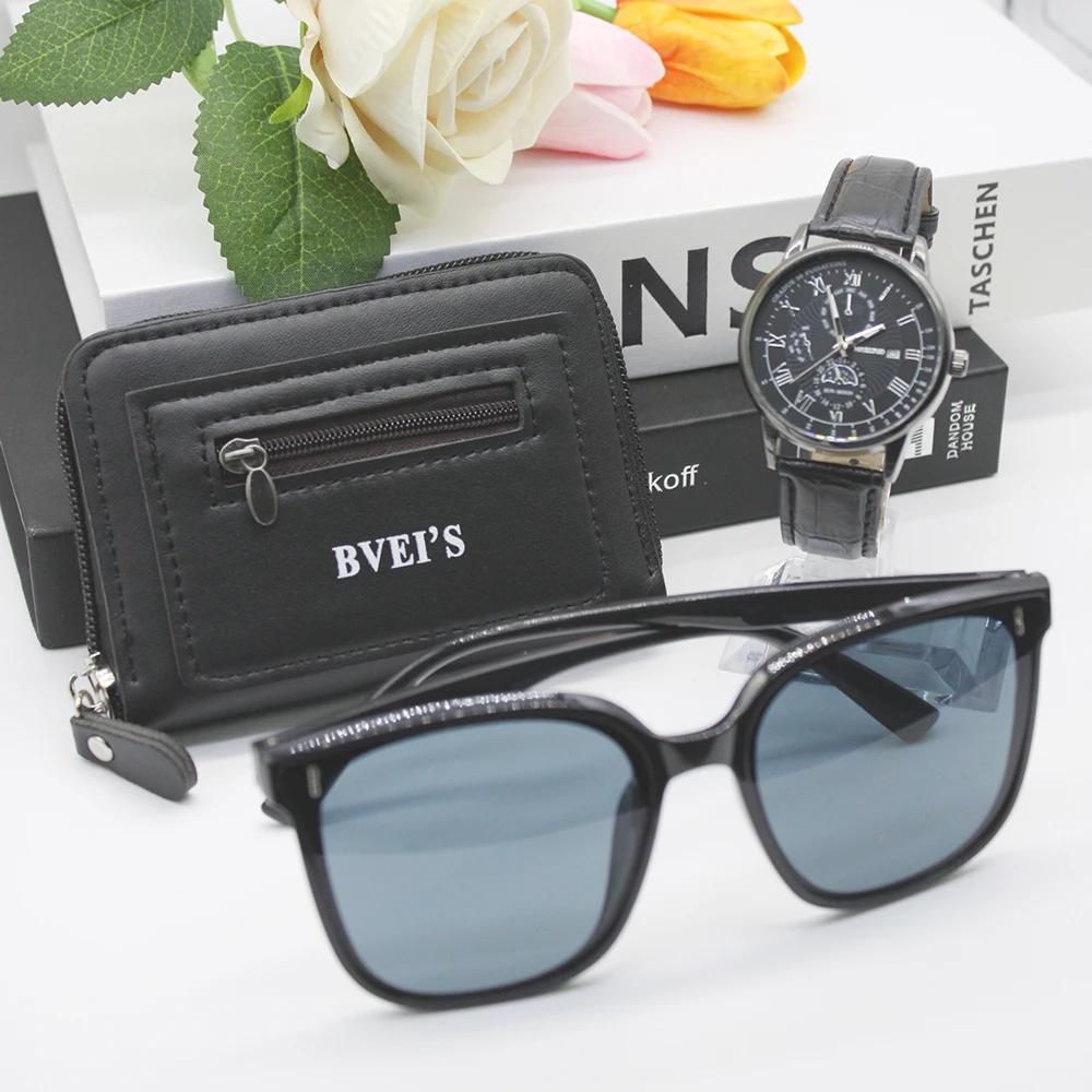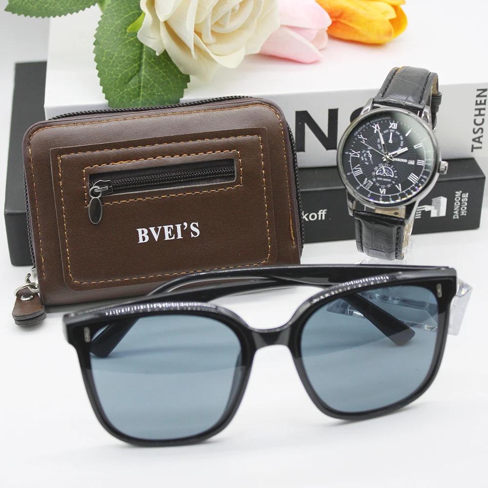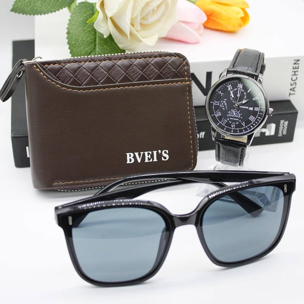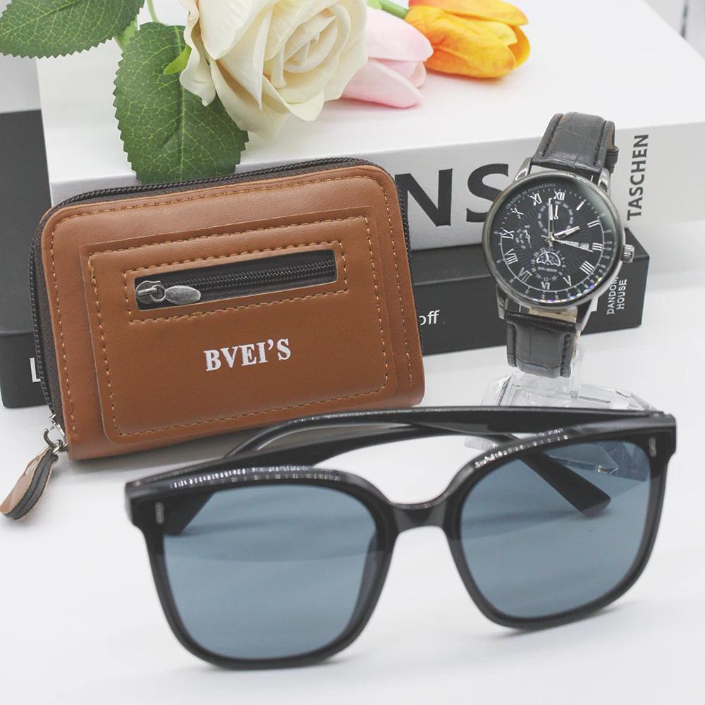 Набор из 3 предметов, новые часы для мужчин, солнцезащитные очки Leluxury, держатель для карт, мужские кварцевые часы высокого класса для парня, подарок на открытом воздухе