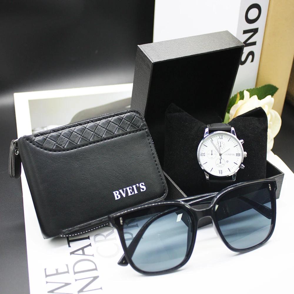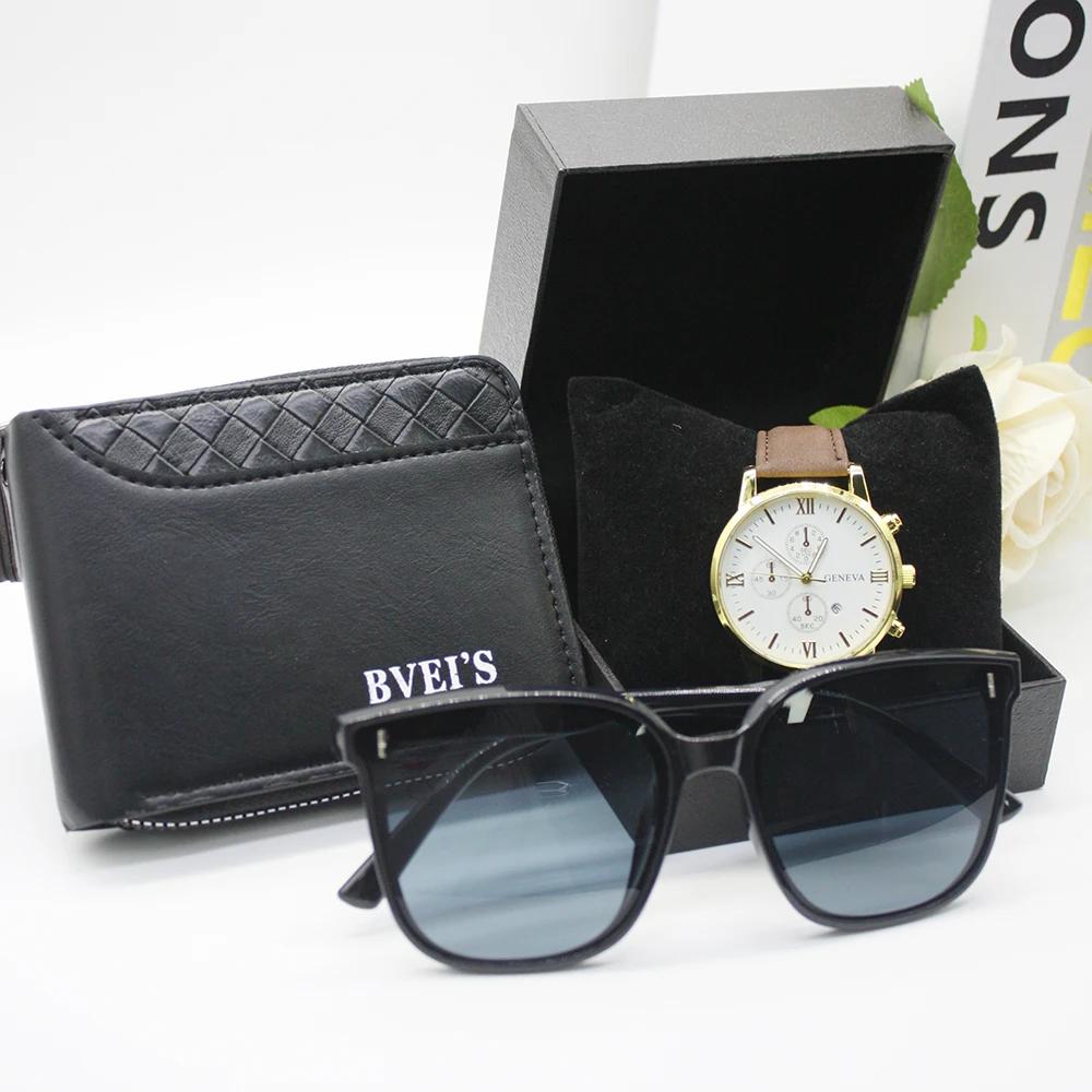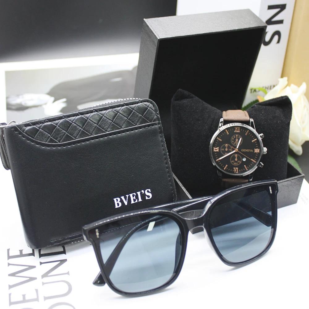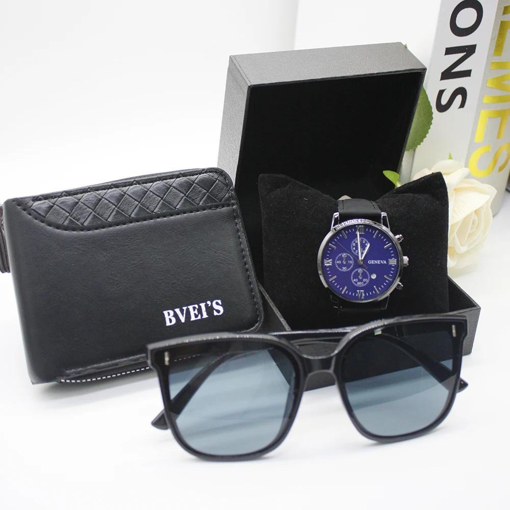 Комплект из 4 предметов, солнцезащитные очки для активного отдыха, часы, мужские кошельки, ремешок, круглый циферблат, мужские очки для мужчин, в комплект входит браслет, коробка для праздничного подарка
