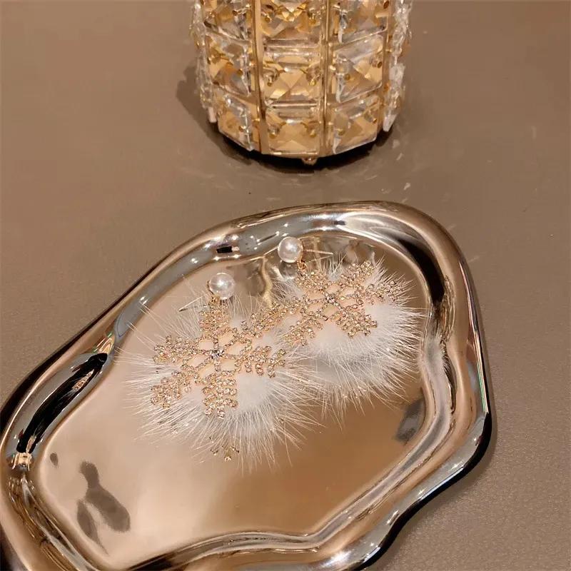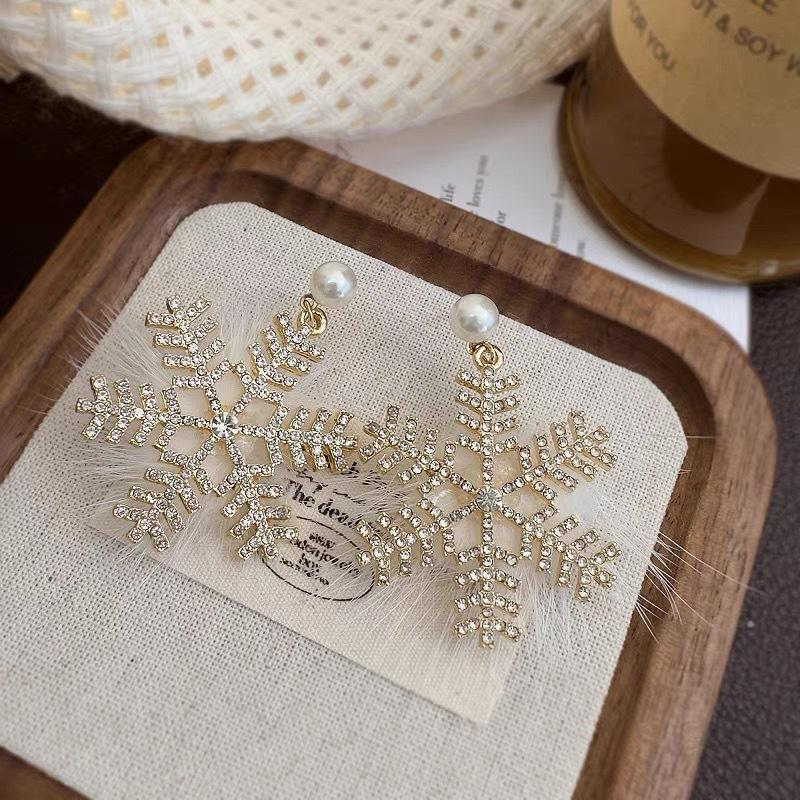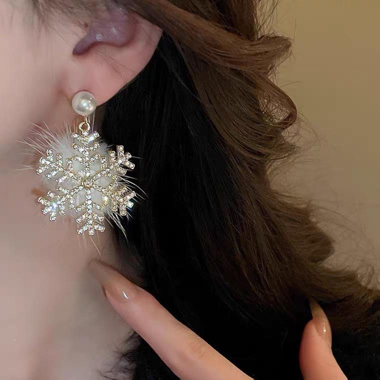Элегантные серьги-пусеты «Снежинки» с цирконом, жемчугом и искусственным мехом для Рождества и официальных мероприятий
