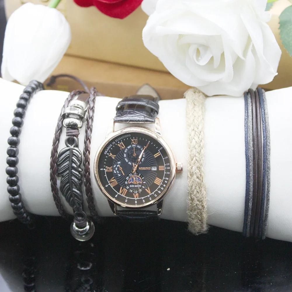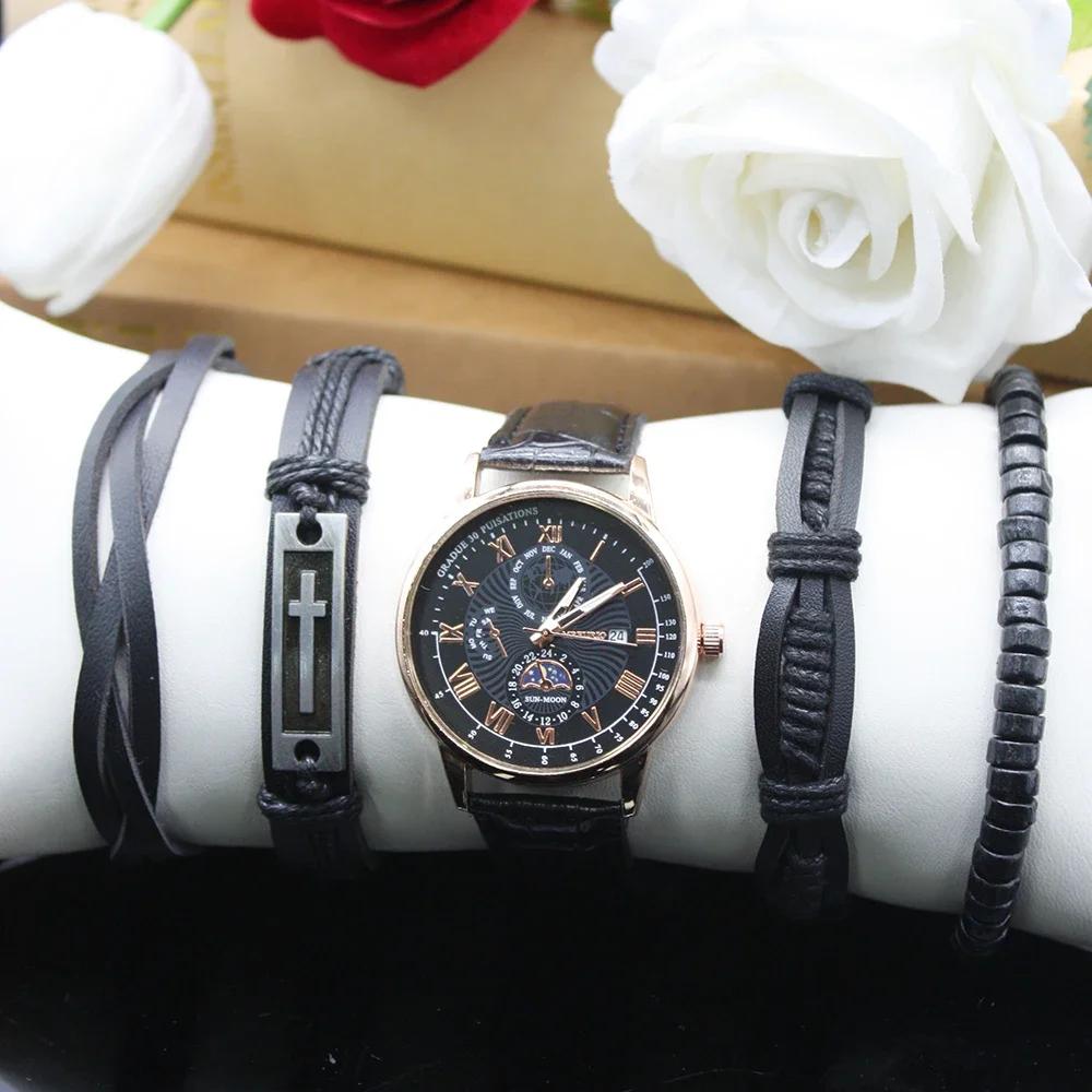 Набор из 5 предметов, модные новые кварцевые часы-браслет с календарем, джентльменский круглый циферблат, классические часы для подарка, включая коробку для браслета