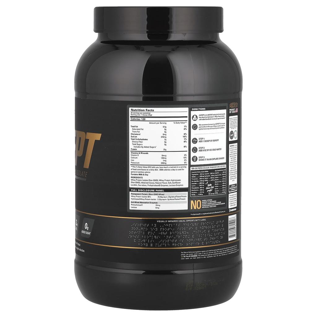 Product Description: 25g protein, 0g trans fat, 2g carbohydrates, 0g added sugars* Free of artificial flavors and colors Product nutritional information GMP compliant Diad ProHydrolase® Enhancing human potential Leading the industry since 2012 Provides muscles with essential nutrients needed for optimal growth and recovery We created IsoPept Hydrolyzed Whey Protein Isolate for anyone who needs the highest quality post-workout protein for immediate delivery. Here's what makes IsoPept special: 1.25g: Non-GMO Hydrolyzed + WPI -Pre-digested, fast-absorbing premium quality protein for a post-workout formula2. Anti-bloating absorption enzyme - Prohydrolase (patented enzyme) combined with lactase ensures that IsoPept is easily digested/absorbed without causing bloating, gas or discomfort.3. Natural Calcium Bone Strengthening - Natural calcium derived from whey protein promotes bone, muscle and nerve health6. Free from artificial fragrances/colors | Aspartame/Ace K Free - All flavors are natural and the taste is irresistibly delicious. It's difficult to quit drinking once and for all.Free from bulking agents. Contains no banned substances. Completed triple-institution and third-party inspection and verification. Recover faster after intense exercise. Feel the difference with IsoPept. Amino spikes, prohibited ingredients, added casein, added sugar, aspartame & acesulfame potassium, artificial food dyes Full panel disclosed Transparent protein (non-GMO) Whey protein isolate 90%, equivalent amount of 26.45g, actual test completed, 23g of protein hydrolyzed Whey protein isolate 2.22g equivalent amount 2g actually tested protein Anti-bloating absorption enzyme ProHydrolase® 25mg Lactase 6mg We are proud of this. I have it and there is nothing to hide.