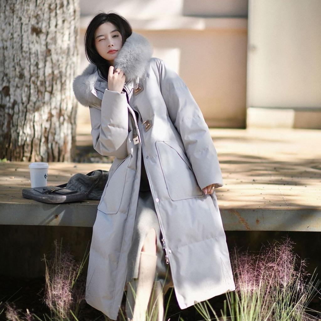 Пуховик женский средний и длинный зима 2024 новая мода, иностранный стиль и тонкий дизайн чувство белого утиного пуха утолщенное пальто