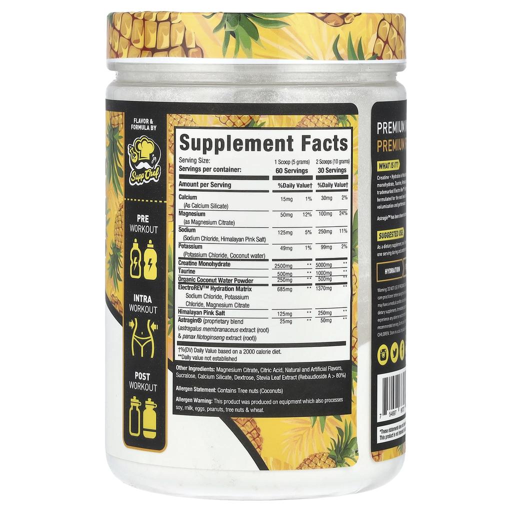 Product Description: Fortified with Astragin® Powered by ElectroRev™ SupplementsNatural and Artificial FlavorsSupp Chef's Flavors and FormulasPre-Workout SupplementFood to Take During WorkoutPost-WorkoutHydration ReplenishmentStrength RecoveryPremium Ingredients, Premium EffectsProduct Description: Creatine + Hydration is Creatine Musclesport's formula consists of monohydrate, taurine, Himalayan pink salt, coconut water, trademarked Electro Rev™ Electrolyte complex, and Astragin™. It's a unique combination. Astragin™ takes creatine utilization, cellular hydration, volume enhancement and athletic performance to the next level. Astragin™ has been shown to increase creatine absorption by up to 33%.