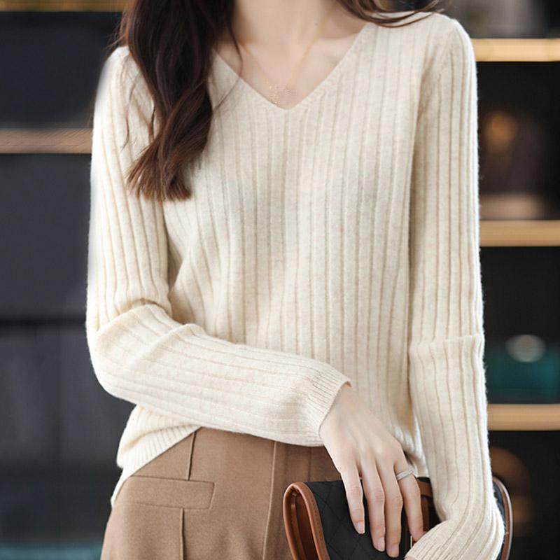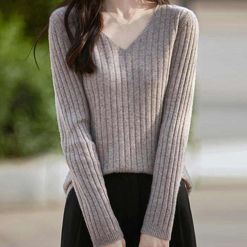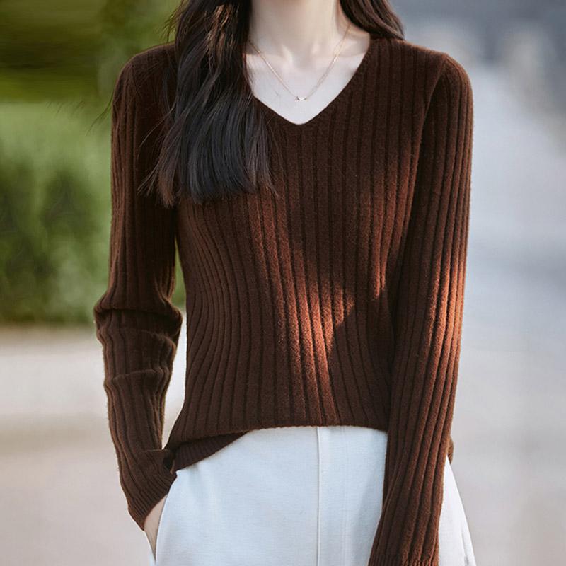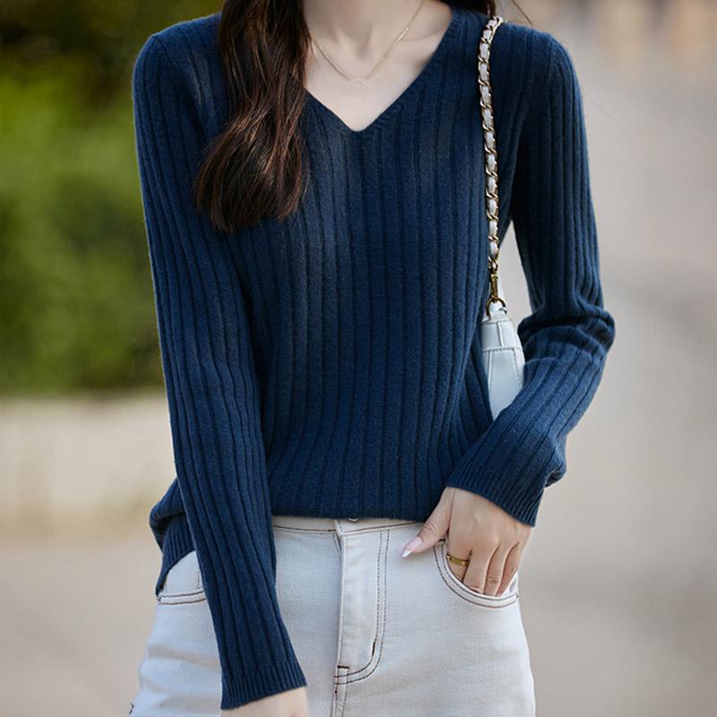 Женские свитера, пуловеры 2025 Осень-Зима Длинный рукав V-образный вырез Черный вязаный свитер Женские топы, пуловер JJ122