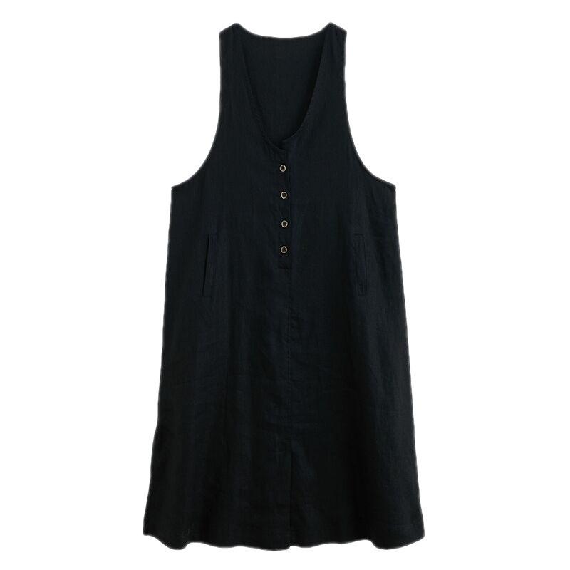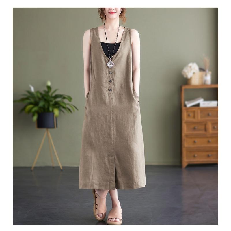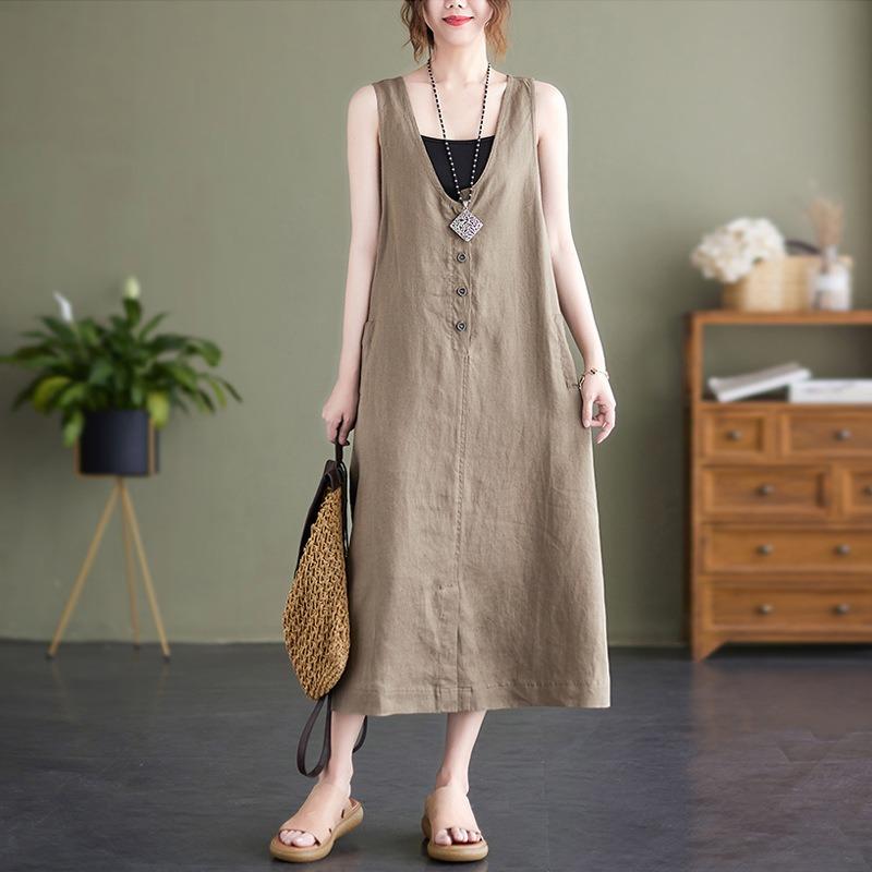 Летнее художественное свободное однотонное хлопковое конопляное платье с V-образным вырезом без рукавов для женщин, повседневные платья средней и большой длины