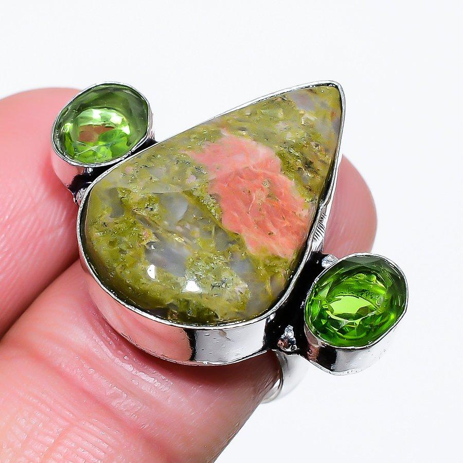 Унакит, Перидот Ручная работа 925 Стерлинговое серебро Ювелирное кольцо Размер 7,5 D3B69