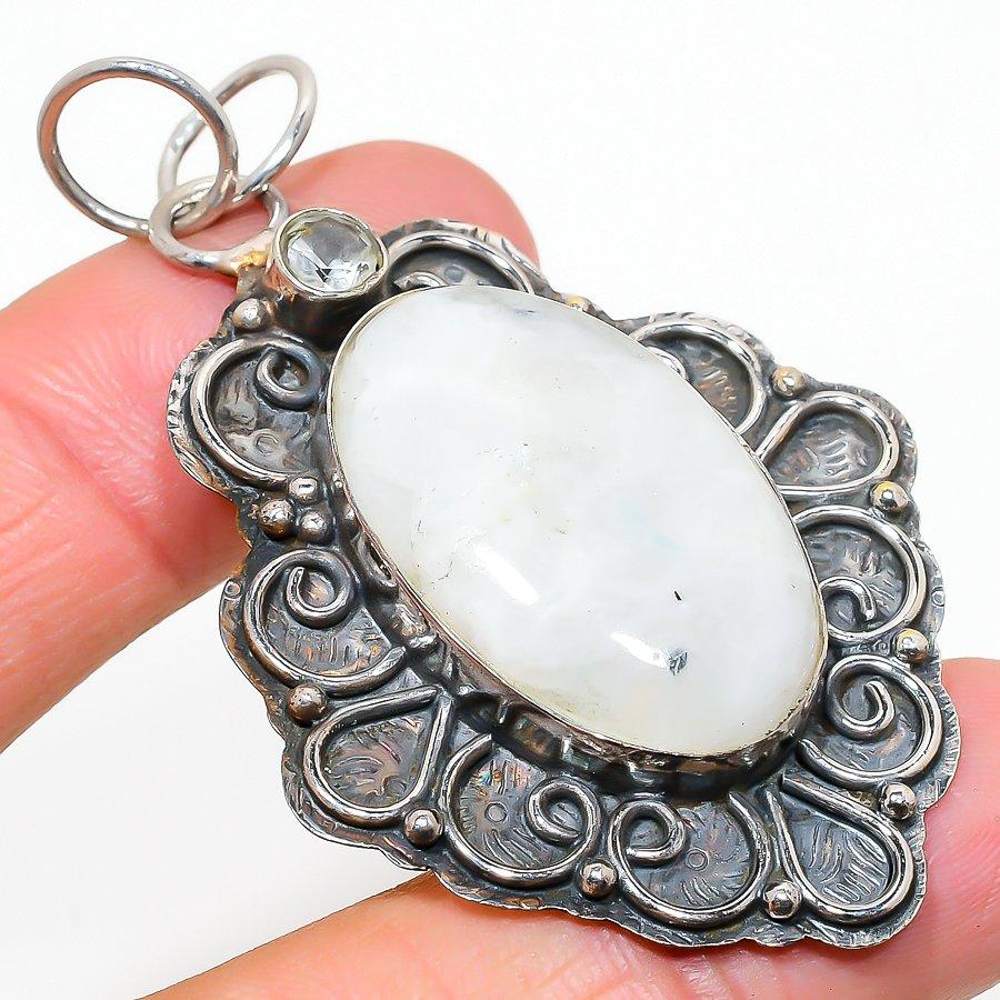 Радужный лунный камень Ручная работа 925 стерлинговое серебро Подарочная подвеска 2,60"