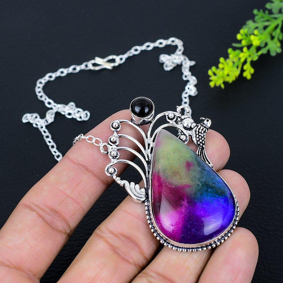Радужный солнечный кварц, оникс, этническое ожерелье из серебра 925 пробы 18" C1J07