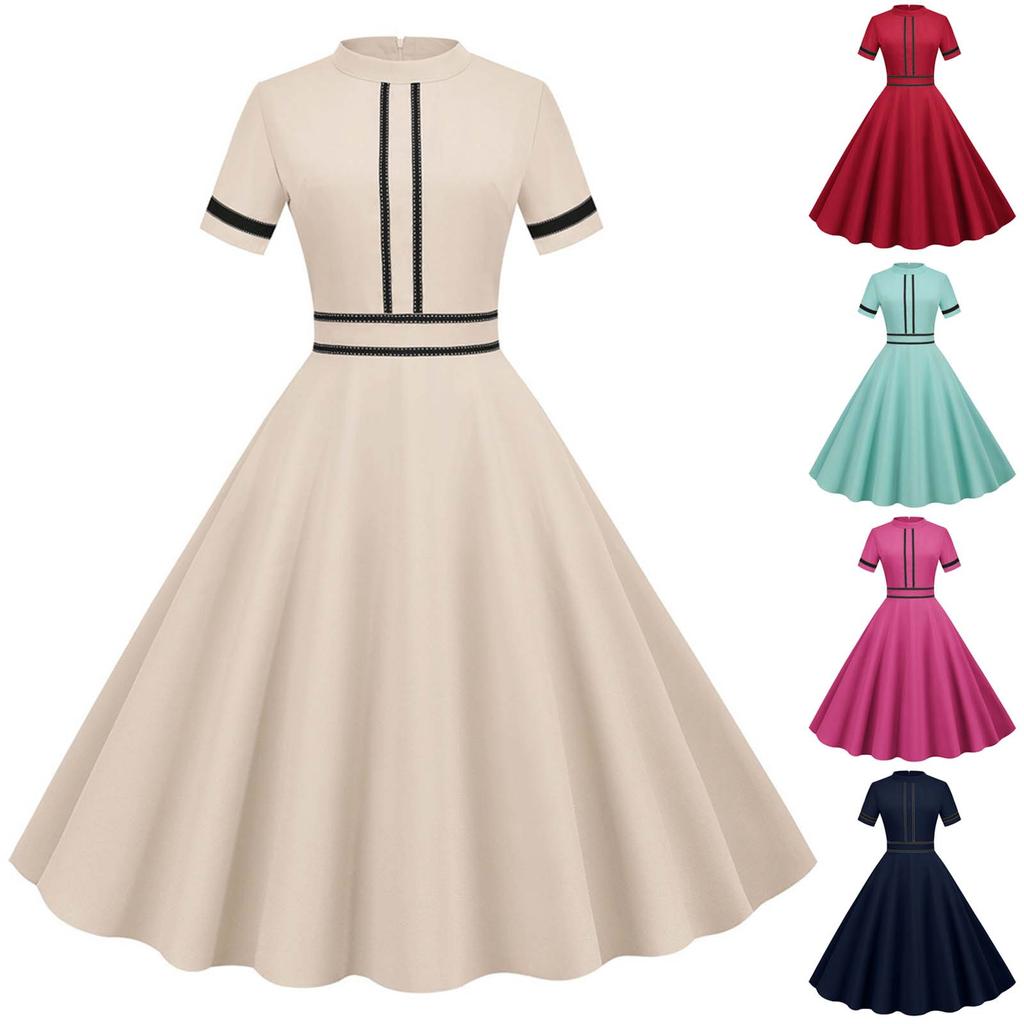Женское однотонное винтажное модное вечернее платье с короткими рукавами и воротником-стойкой — купить товар онлайн с бесплатной доставкой до всему миру!