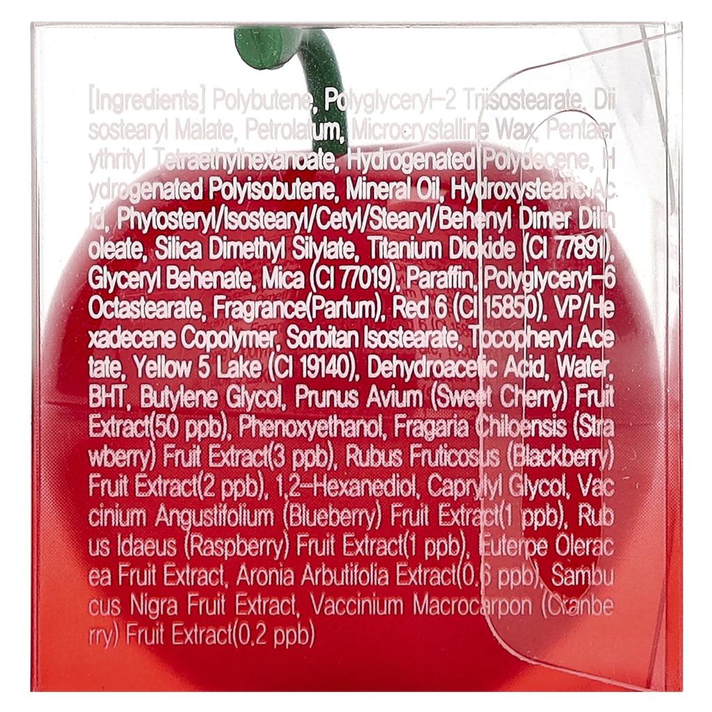Ингредиенты: Полибутен, полиглицерил-2 триизостеарат, диизостеарилмалеат, вазелин, микрокристаллический воск, пентаэритритилтетраэтилгексаноат, гидрогенизированный полидецен, гидрогенизированный полиизобутен. Ten, минеральное масло, гидроксистеариновая кислота, фитостерил/изостеарил/цетил/стеарил/бегенил димер дилинолеат, диметилсилилат кремния, диоксид титана (CI77891), глицерилбегенат, слюда (CI77019), парафин, полиглицерил-6 окта. Стеарат, ароматизатор, красный Нет. 6 (CI 15850), Сополимер ВП/гексадецена, изостеарат сорбитана, ацетат токоферола, желтый Нет. 5 алюминиевое озеро (CI19140), дигидроуксусная кислота, очищенная вода BHT, бутиленгликоль, черешня (Prunus avium) фруктовый экстракт (50ppb) , феноксиэтанол, клубника (земляника чилийская) фруктовый экстракт (3ppb), ежевика (Rubus fruticosus) фруктовый экстракт (2ppb), 1,2-гександиол, каприлилгликоль, черника (Вакциниум узколистный) фруктовый экстракт (1ppb), малина (Rubus idaeus) фруктовый экстракт (1ppb), асаи пальма (Euterpe oleracea) экстракт плодов, экстракт аронии древовидной (0,6 частей на миллиард), старший (Бузина черная) экстракт плодов клюквы (Макрокарпон вакцины) фруктовый экстракт (0,2 ч / млрд).
