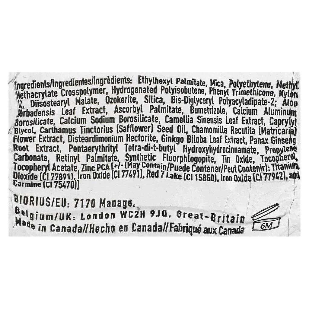 ethylhexyl palmitate, mica, polyethylene, methyl methacrylate crosspolymer, hydrogenated polyisobutene, phenyl trimethicone, nylon 12, diisostearyl maleate, ozokerite, silica, bis-diglyceride lilpolyacyl adipate-2; aloe vera (aloe barbadensis) leaf extract, ascorbyl palmitate, bumetrizole, calcium aluminum borosilicate, calcium sodium borosilicate, green tea (camellia sinensis) leaf extract, caprylyl glycol, safflower (carthamus tinctorius) seeds. oil, matricaria (chamomilla recutita) flower extract, disteadimonium hectorite, ginkgo biloba leaf extract, panax ginseng root extract, pentaerythrityl tetra-di-t-butylhydroxyhydrocinnamate, propylene carbonate, retinyl palmitate, synthesis contains fluorophlogopite, tin oxide, tocopherol, tocopheryl acetate, zinc pca[+/- available ingredients: titanium dioxide (ci 77891), iron oxide (ci77491), red no. 7 aluminum lake (ci15850), iron oxide (ci 77942), carmine (ci 75470)].