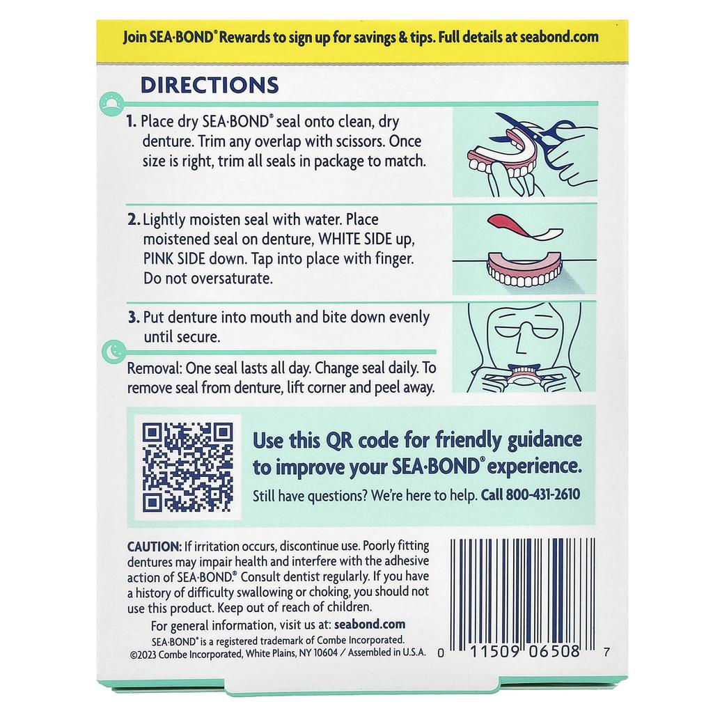 Как пользоваться продуктом: Поместите сухой уплотнитель SEA·BOND® на чистый, сухой зубной протез.. Оставшуюся часть обрежьте ножницами.. Как только размер будет выбран правильно, обрежьте все уплотнители на упаковке, чтобы они совпадали.. Слегка смочите защитное уплотнение водой.. Поместите влажную пломбу на зубной протез белой стороной вверх, а розовой стороной вниз.. Нажмите пальцами, чтобы закрепить. Не переувлажнять.. Поместите зубные протезы в рот и равномерно прикусите их, пока они не зафиксируются.. Вытереть: Одна печать действует весь день. Заменяйте уплотнения ежедневно.. Чтобы снять пломбу с зубного протеза, приподнимите край и снимите ее.