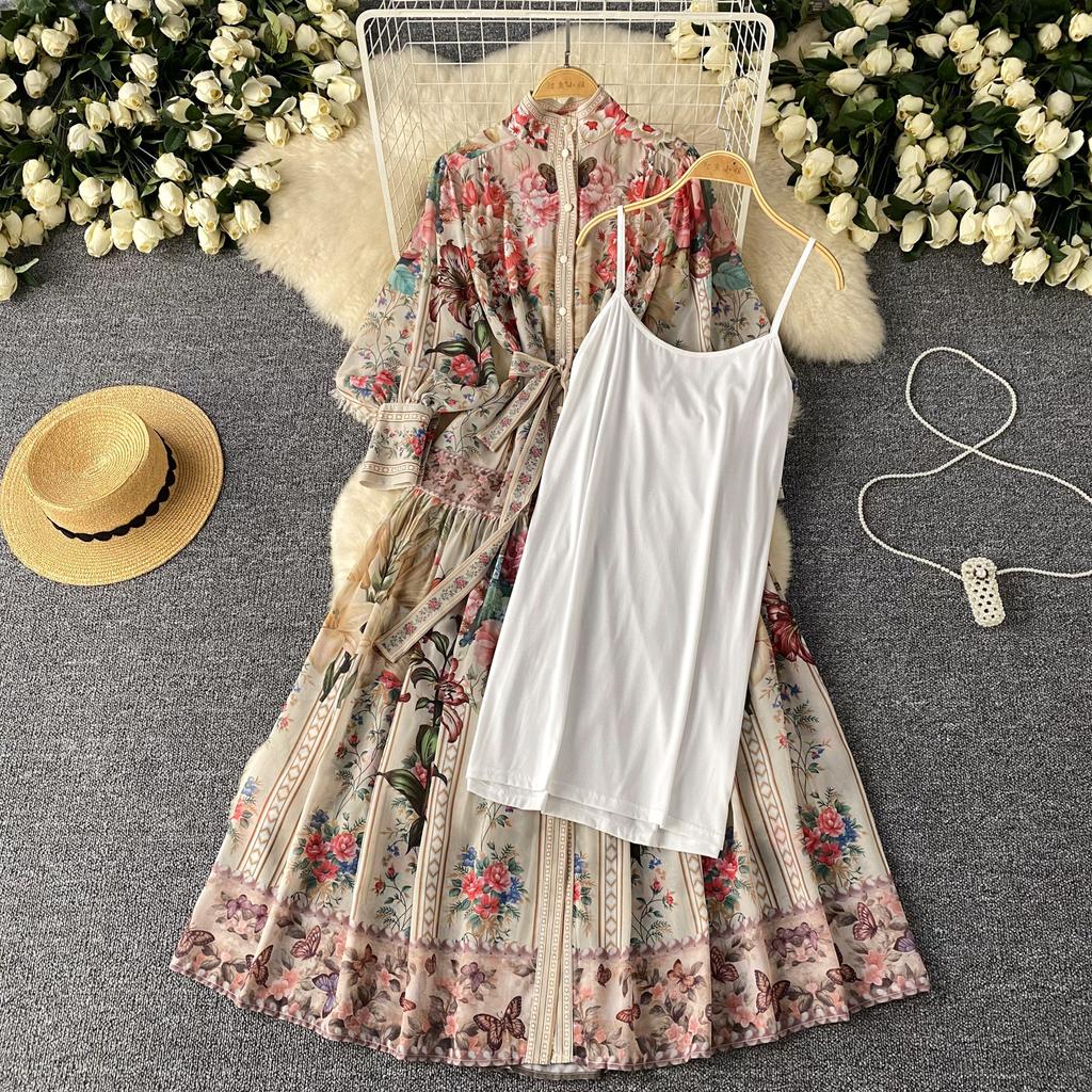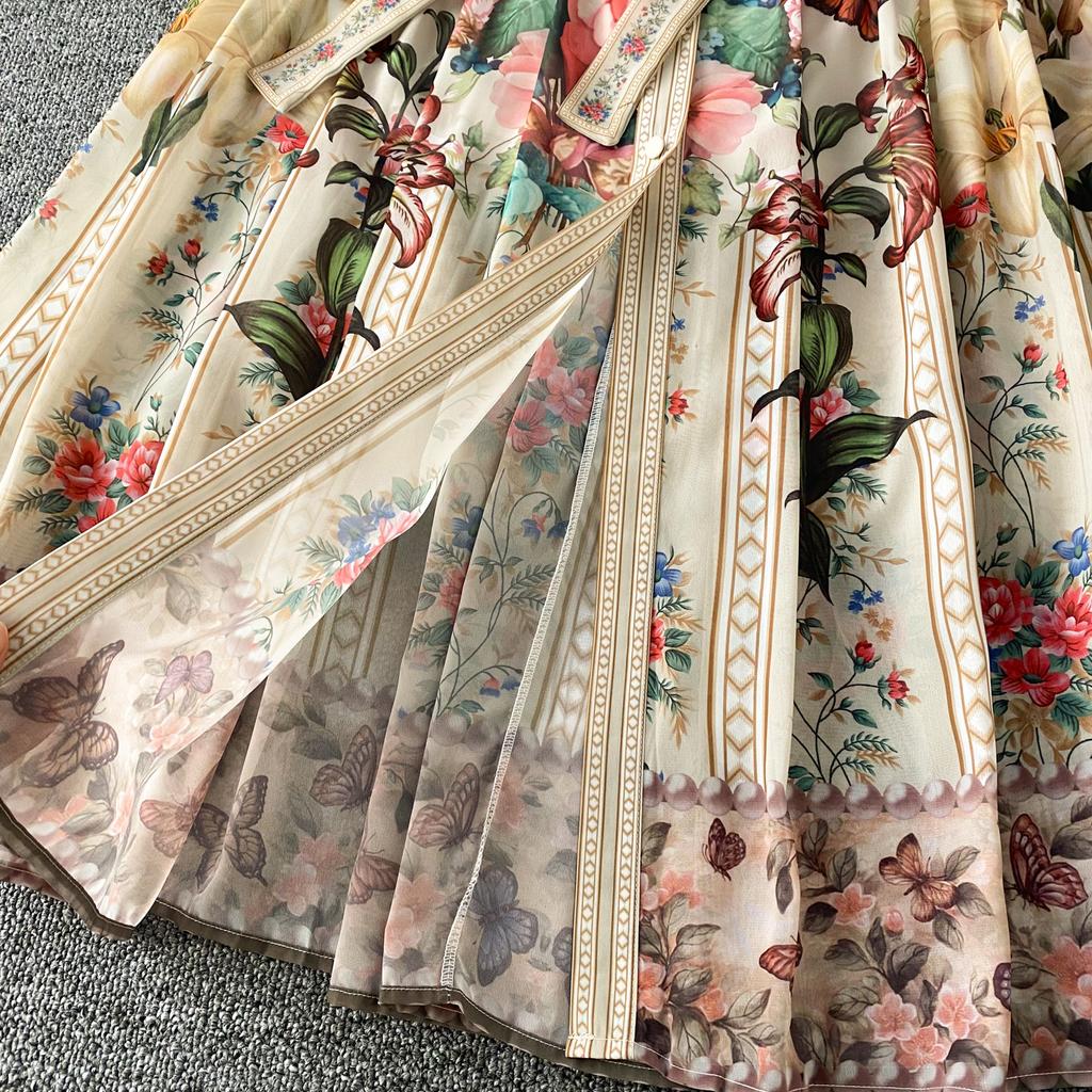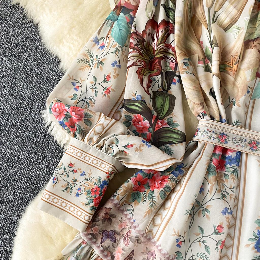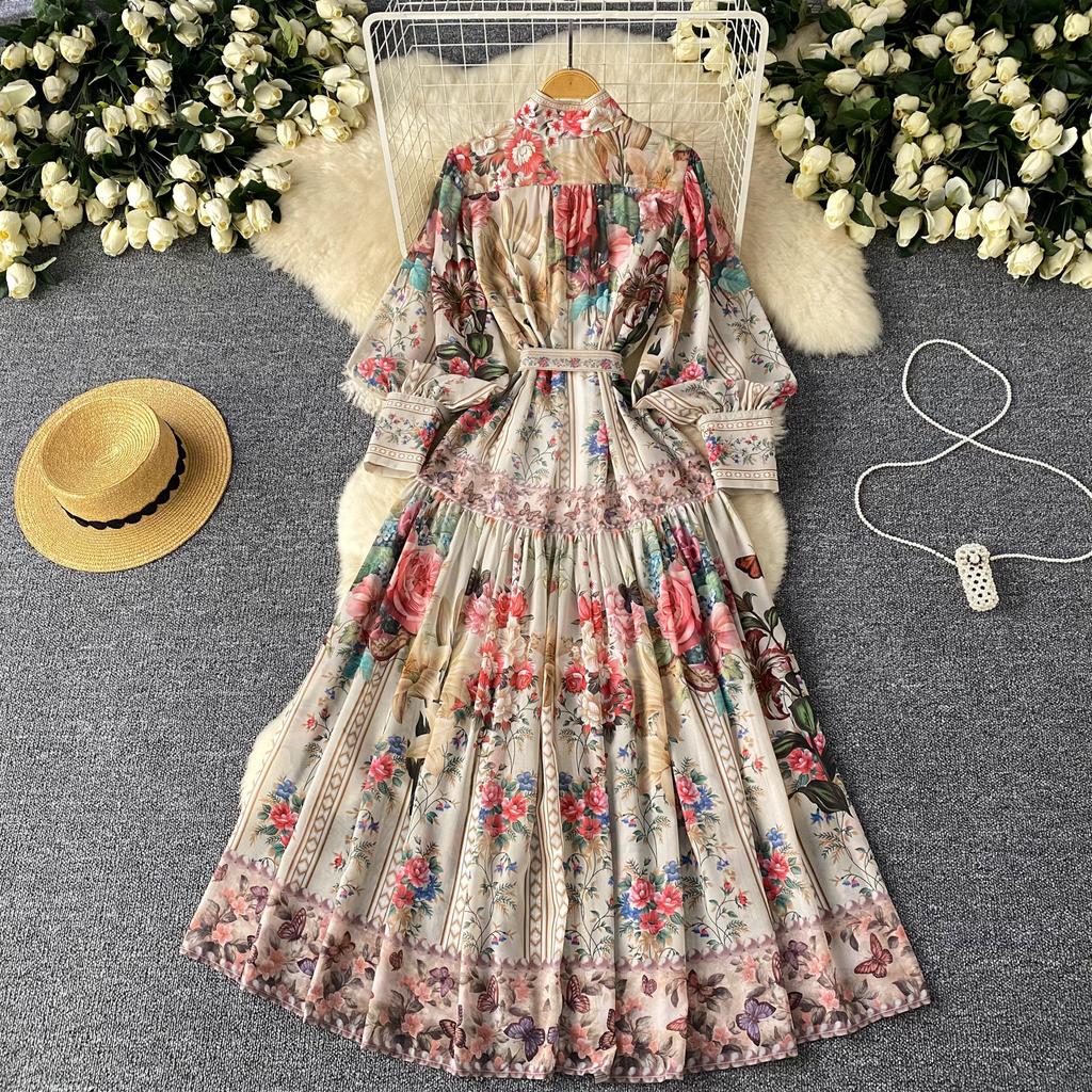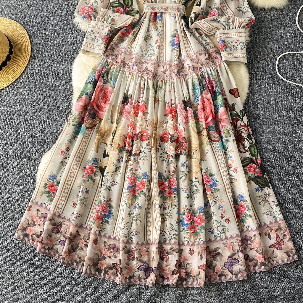 Французский винтажный принт цельное платье женское с рукавами-фонариками однобортное женское платье принцесса шнуровка дизайн одежда