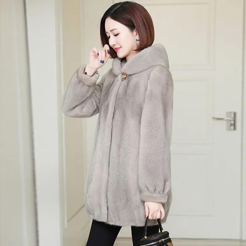 Осенне-зимняя шуба из искусственного меха норки, корейская версия, свободная шуба из норки, женская, с капюшоном, средней длины, утолщенная
