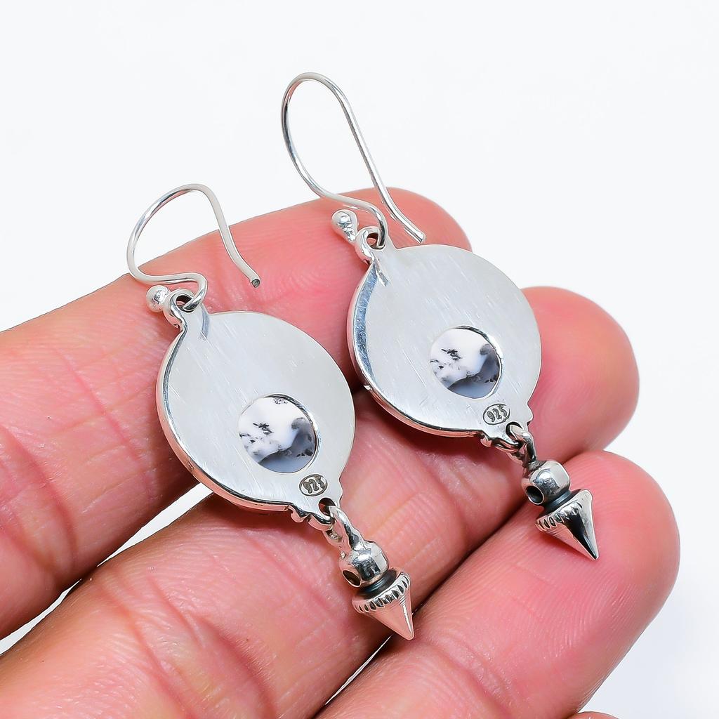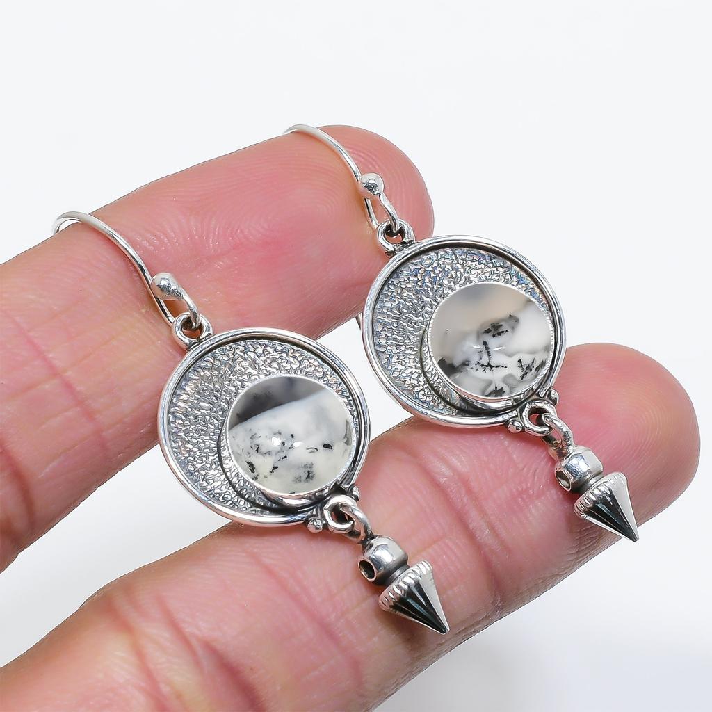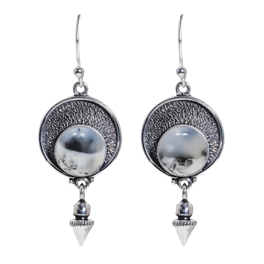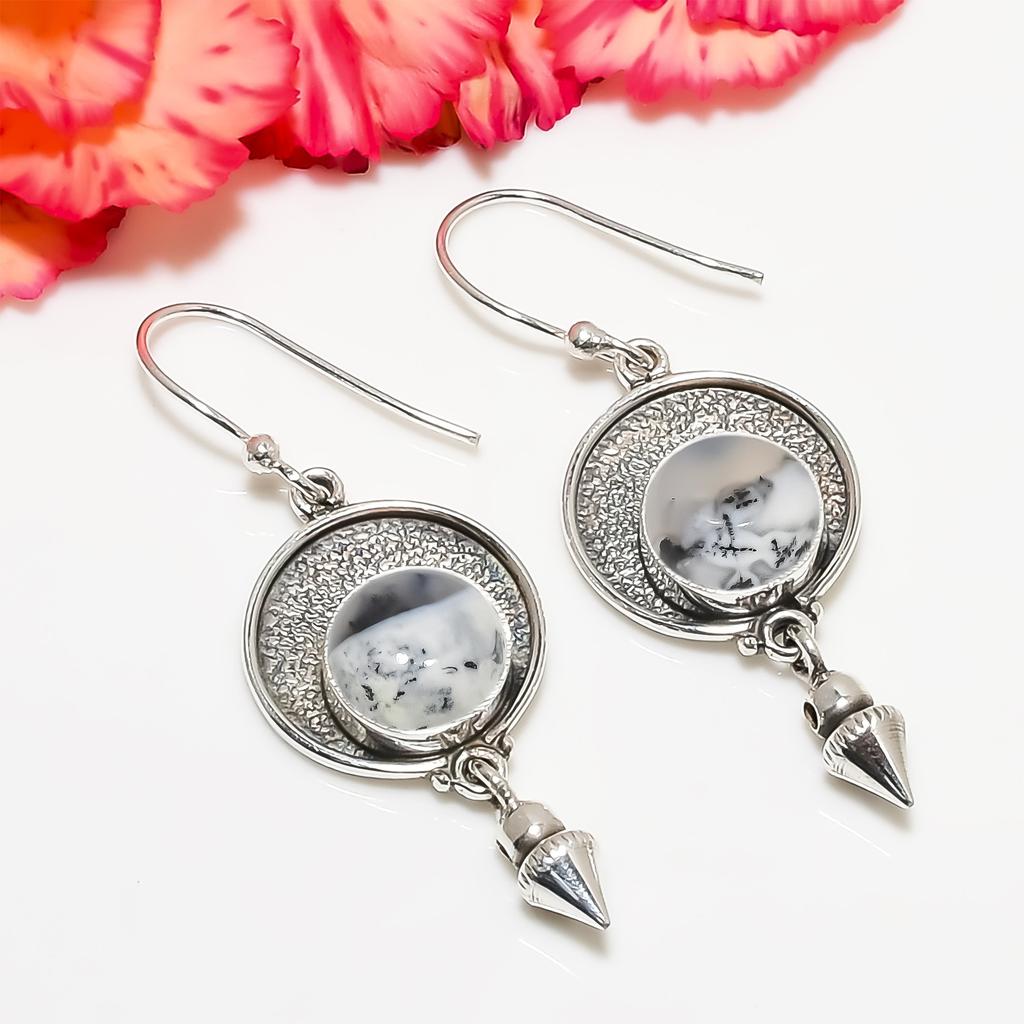 Дендритовый Агат - Бразилия Серьга из стерлингового серебра 925 пробы V6822, Белая серьга, Круглая серьга, Подарок на День святого Валентина, Подарок для нее, Подарок на день рождения, Ручная работа J