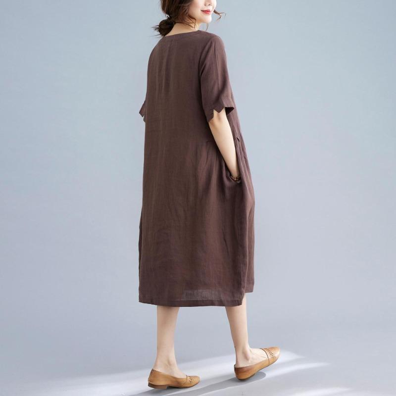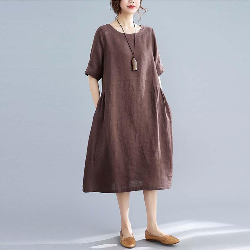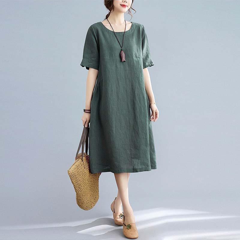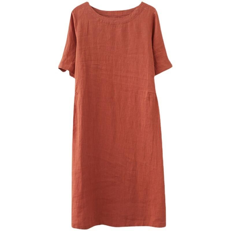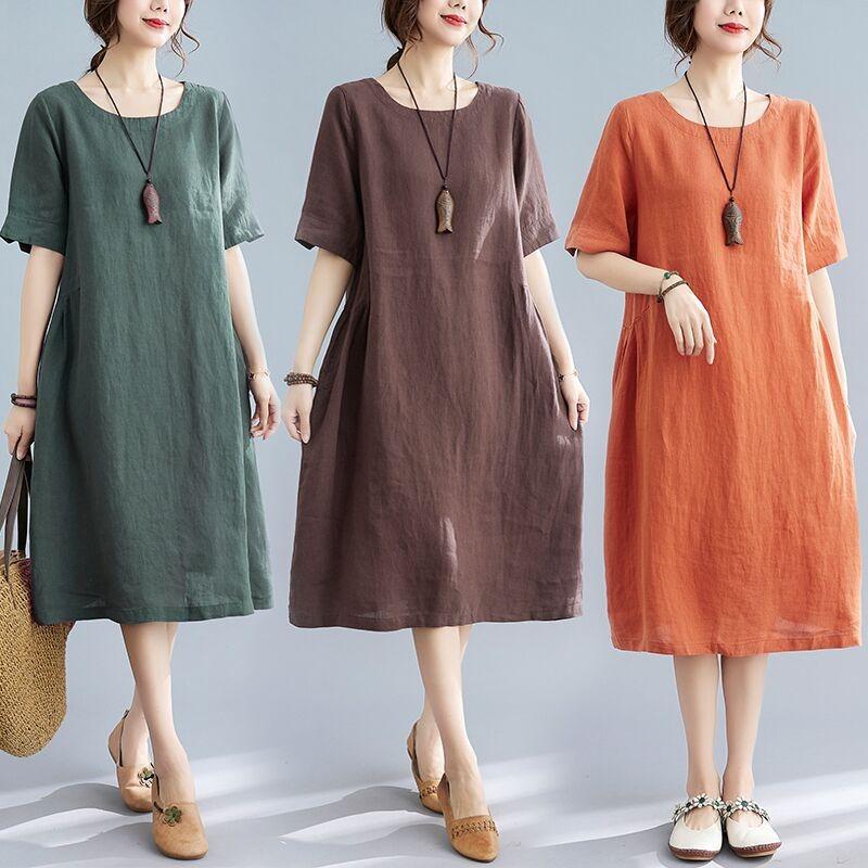 Летнее литературное свободное однотонное хлопковое льняное платье с круглым вырезом и короткими рукавами для женщин, повседневные платья средней длины