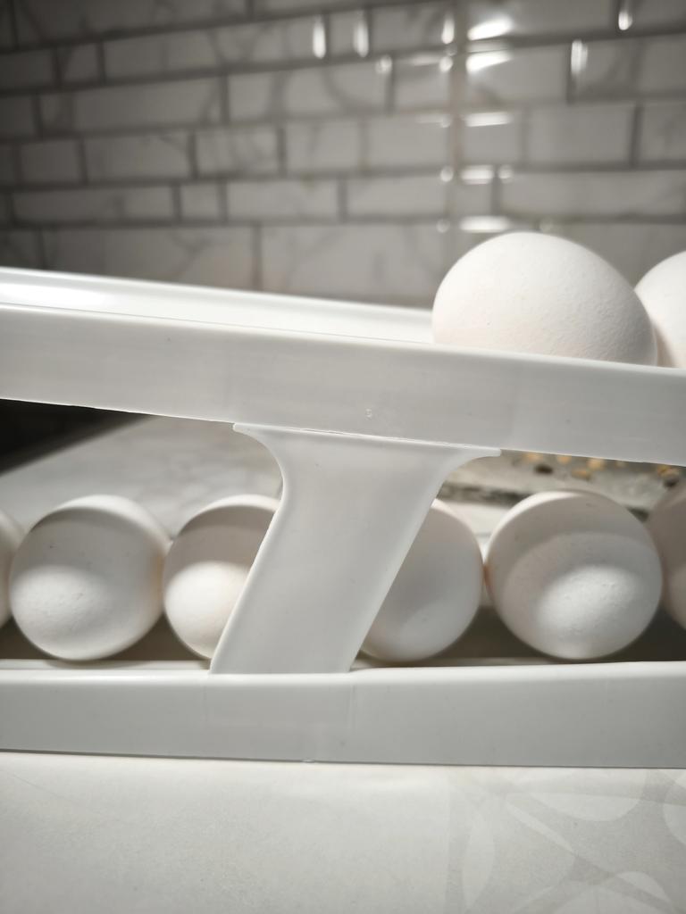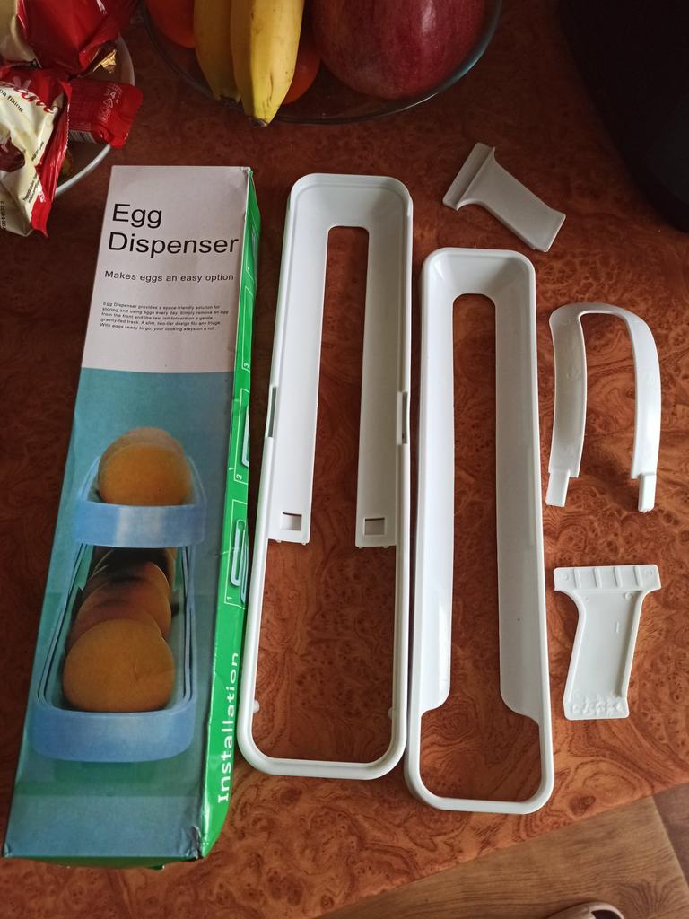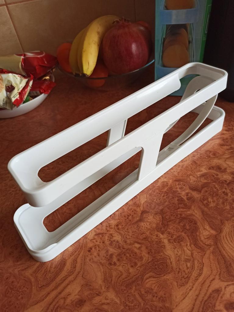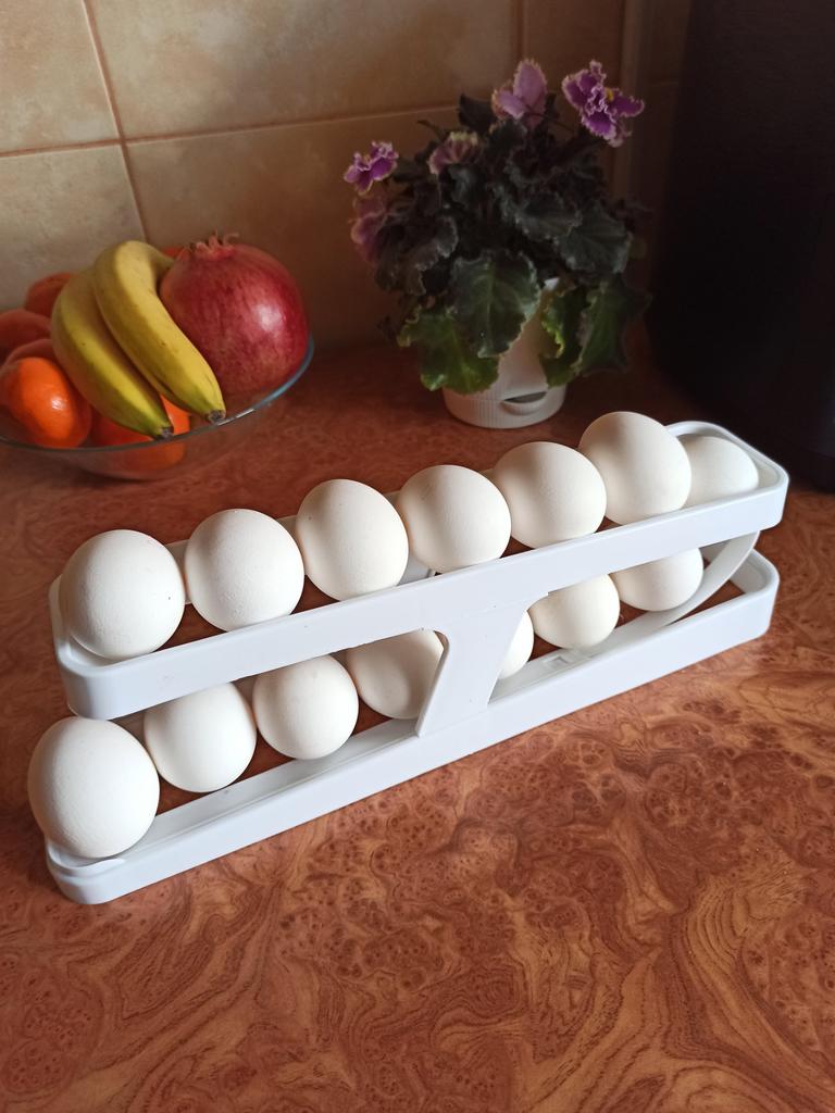 Контейнер-органайзер для яиц Очень удобная вещь. Как для организации порядка в холодильнике, так и удобно пользоваться во время приготовления пищи. Берешь яичко, а остальные с верхнего яруса скатываются вниз. А ещё всегда уверен, что сверху - самые свежие яйца. Вмещает около 17-19 яиц. В зависимости от размера. У меня на фото крупные яйца. Размер нижнего яруса 35*8 см. Верхнего 31*6,7 см. Высота 10,8 см. Выполнен из прочного пластика. Никакого постороннего запаха. Конструкция состоит из 4 частей, которые очень легко собрать даже без инструкции. В фирменной коробочке. Упаковка в этом магазине как всегда выше всех похвал. Доставка очень быстрая, 2-3 недели. Рекомендую 🤗