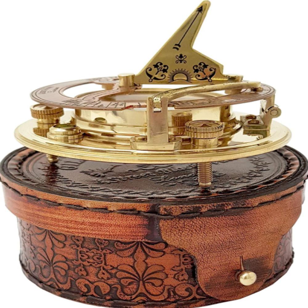 Антикварные латунные солнечные часы-компас с кожаным футляром – 10,16 см
