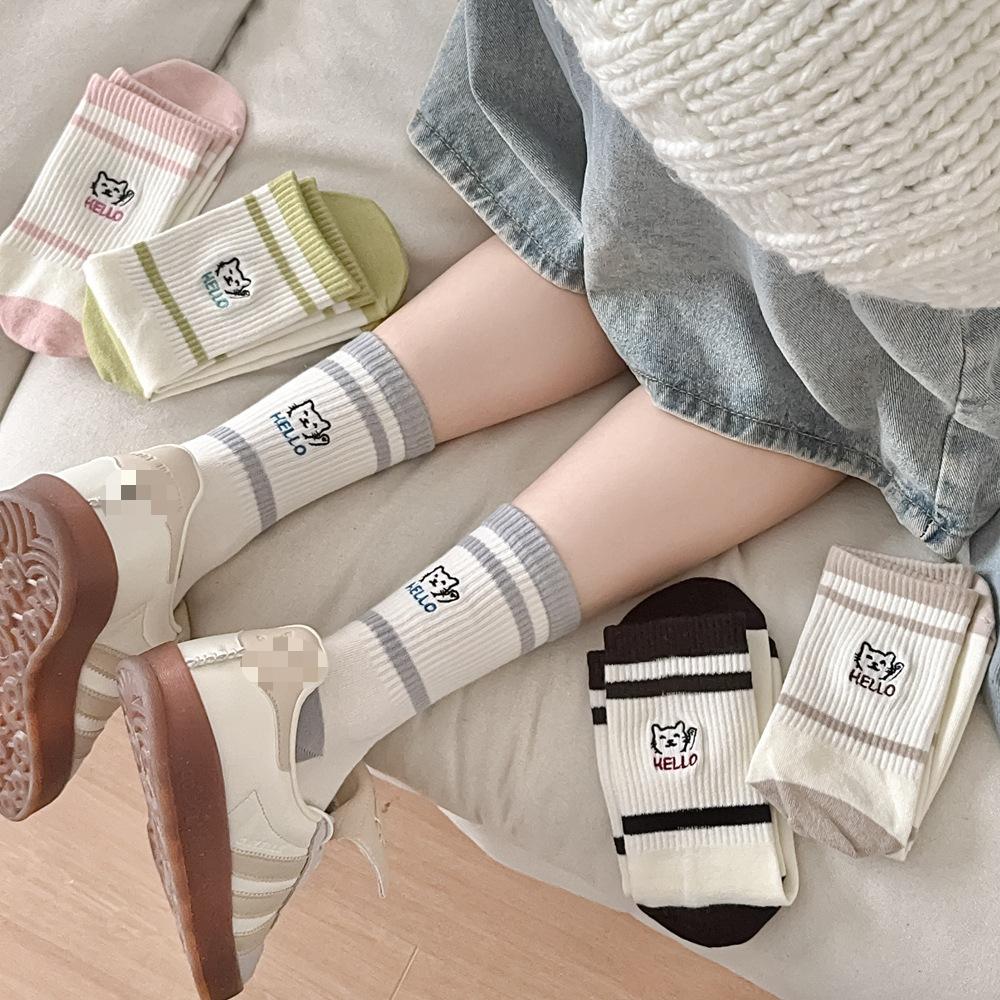 Милые носки с вышивкой в виде мультяшного кота, женские повседневные полосатые модные женские носки для хип-хопа, скейтборда, школьницы, носки средней длины