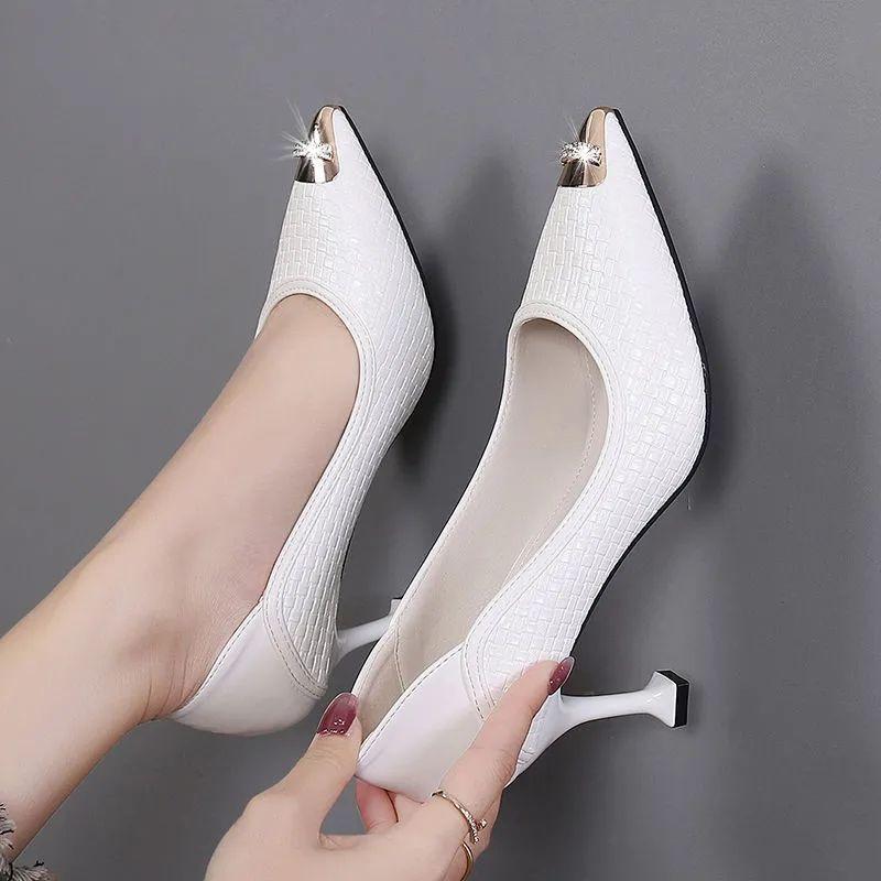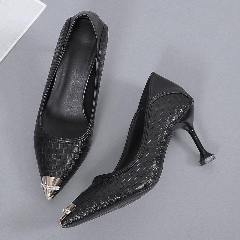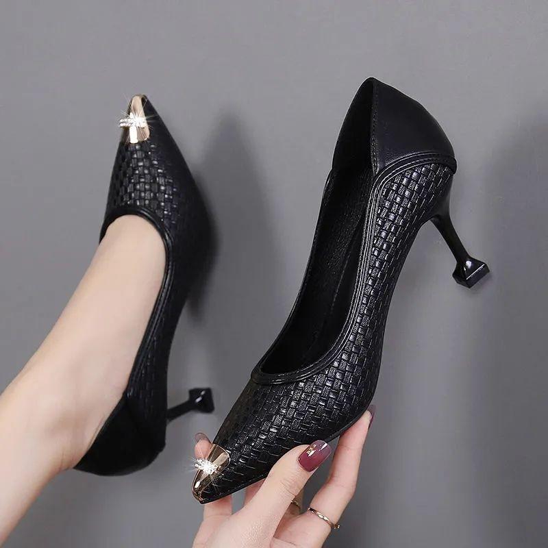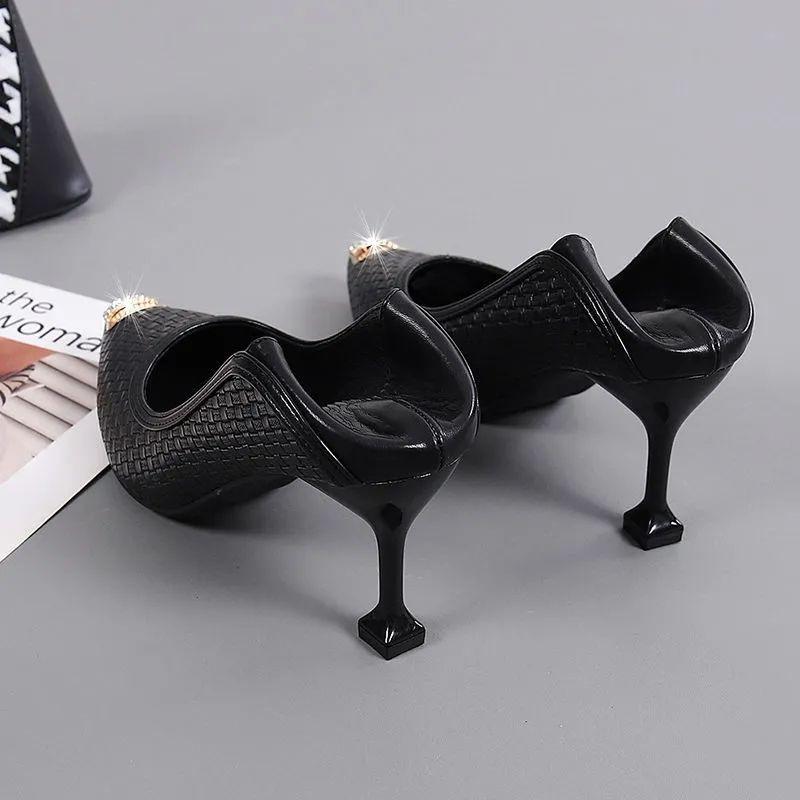 Женская обувь Клетчатая кожа Высокие каблуки Мода Металлический острый носок Туфли-лодочки Сексуальная обувь для вечеринок Женские профессиональные туфли-стилеты на каблуках