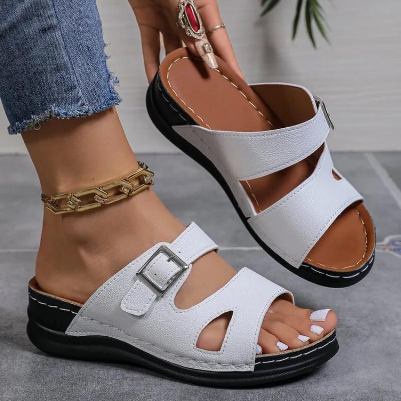 Новые летние тапочки, женские сандалии на танкетке, модный дизайн, уличные прогулочные тапочки на платформе с двойной пряжкой, нескользящая женская обувь