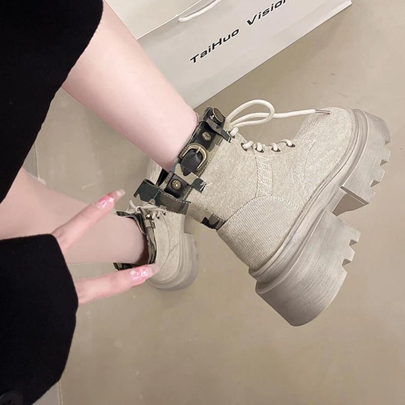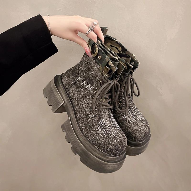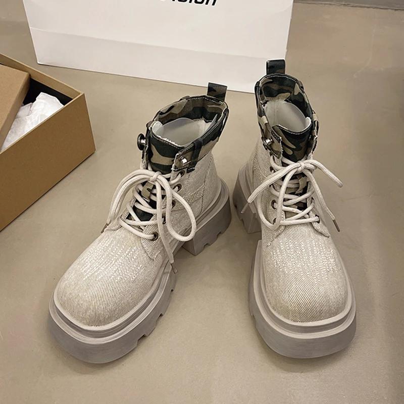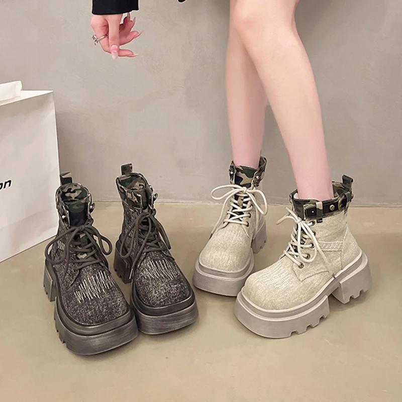 2024 Новые женские рабочие короткие мотоциклетные ботинки на толстой подошве с высокой посадкой, ретро-джинсовые ковбойские ботинки на шнуровке для женщин