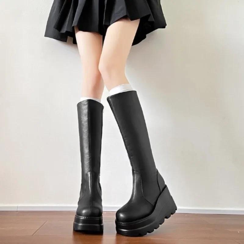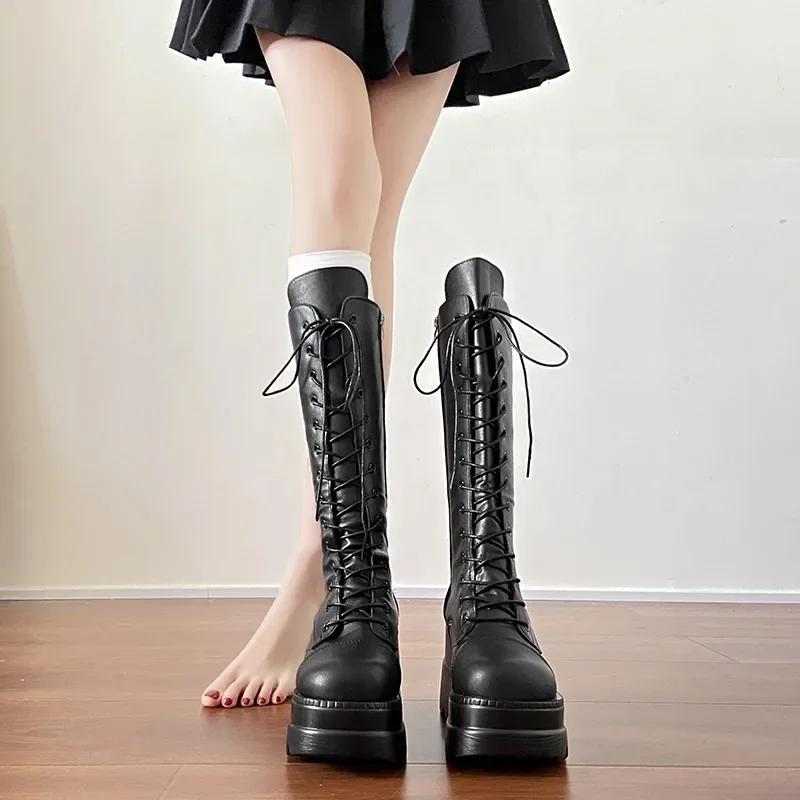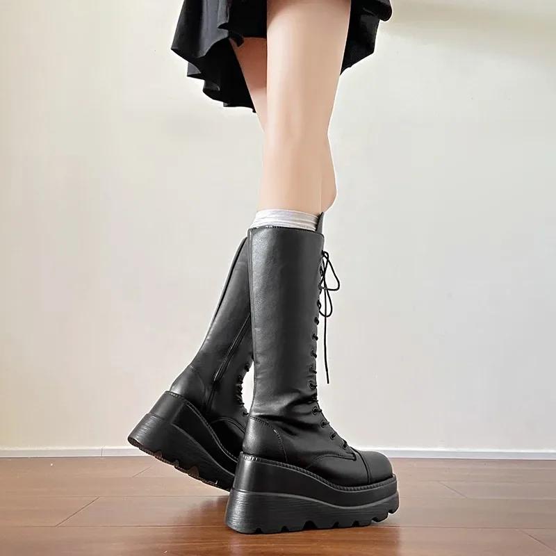 Высококачественные женские сапоги 2024 года, осень-зима, новые стильные сапоги на шнуровке в стиле панк-рыцарь, черные высокие сапоги на танкетке для женщин