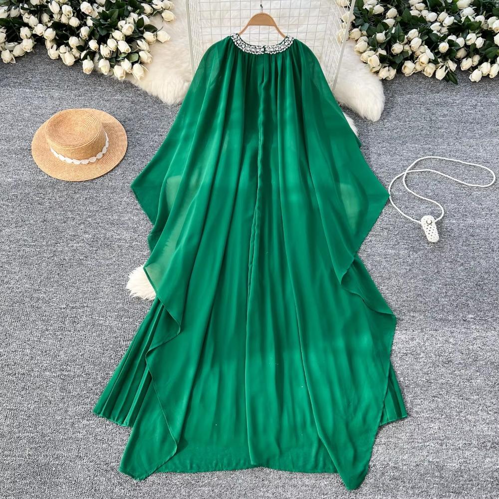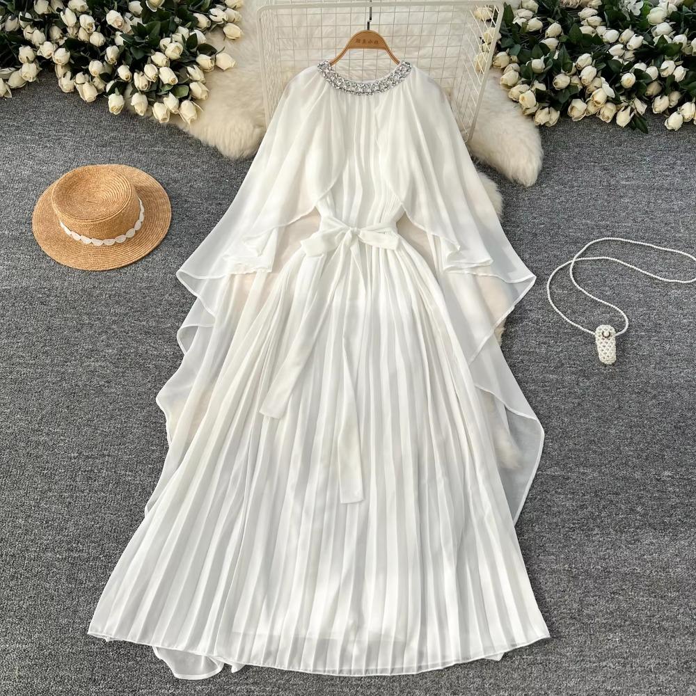 Элегантный горный хрусталь О-образный вырез шнуровка винтажный плащ рукав шикарный шифон тонкий длинный плиссированные платья мода женщины High Street одежда