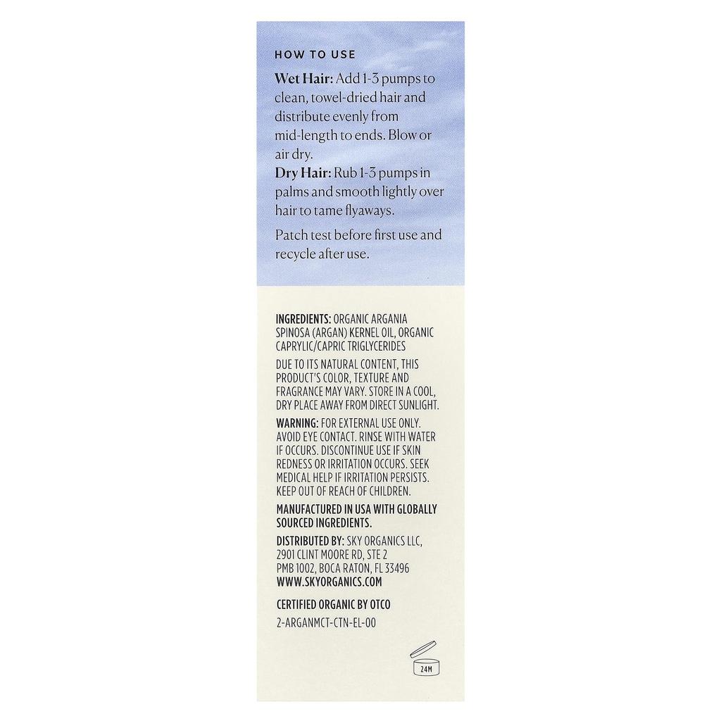 Ингредиенты: Органический арган (Аргания спиноза) косточковое масло, органический каприловый/каприновый триглицерид. Произведено в США из ингредиентов со всего мира.
